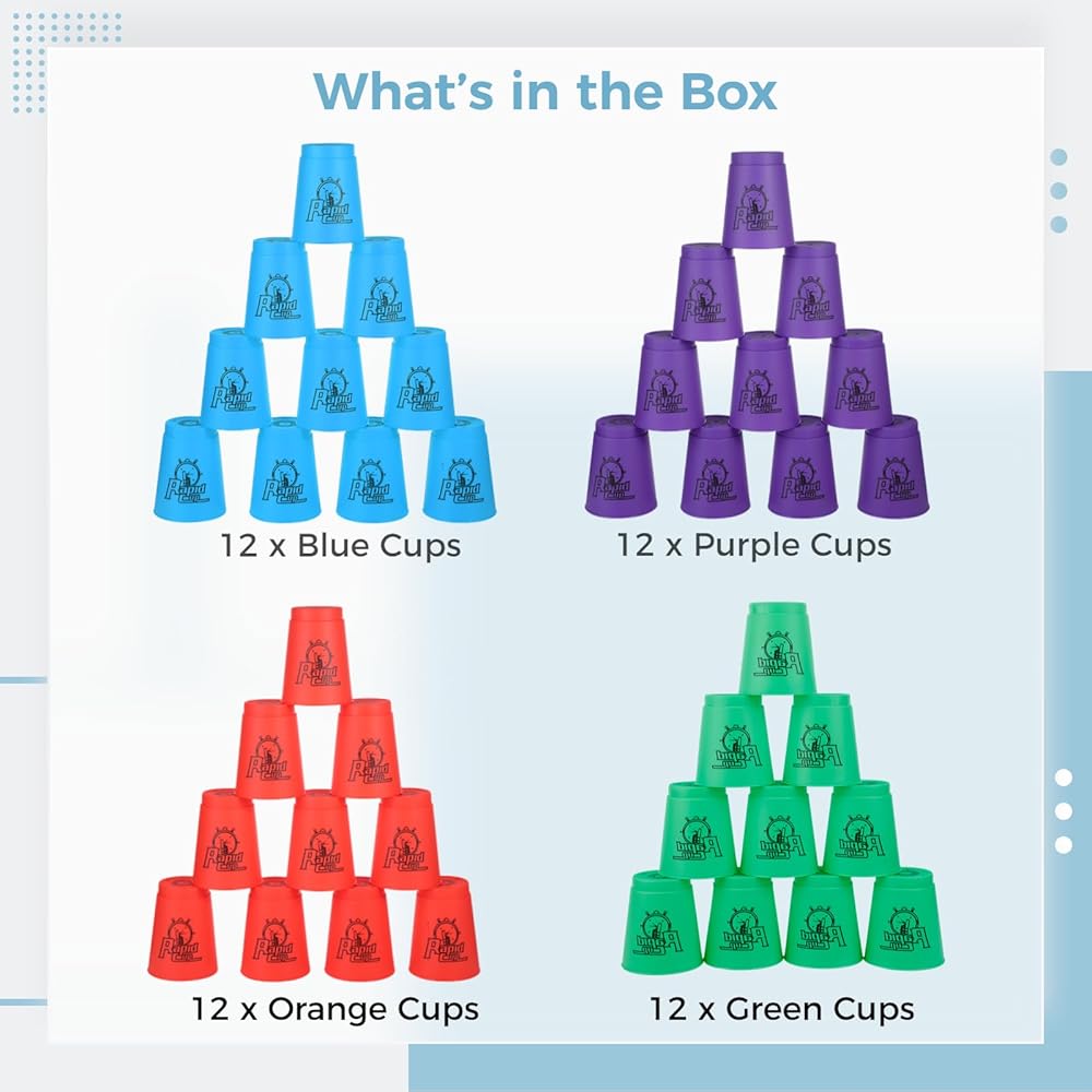 【أكواب تكديس عالية الجودة مكونة من 48 قطعة】جرب التكديس بسرعة البرق مع مجموعتنا المكونة من 48 كوبًا بألوان الأزرق والأخضر والبرتقالي والأرجواني النابضة بالحياة. معبأة في أربع أكياس شبكية مريحة، هذه الأكواب مصنوعة من مواد عالية الجودة ومصممة لتقليل الاحتكاك، مما يجعل عملية التكديس أمرًا سهلاً وتقليل وقت التكديس بشكل كبير!