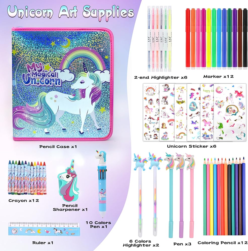 🦄 Creative Kids Art Set --- 56pcs unicorn stationery set for girls includes unicorn pencil case, unicorn stickers x6, unicorn pen x3, unicorn highlighter x2, coloring pencils x12, ruler, 10 colors pen, marker pen x12, dual-end highlighter x6, crayon x12. Scented markers for kids with fruity smell make kids enjoy in art creating.