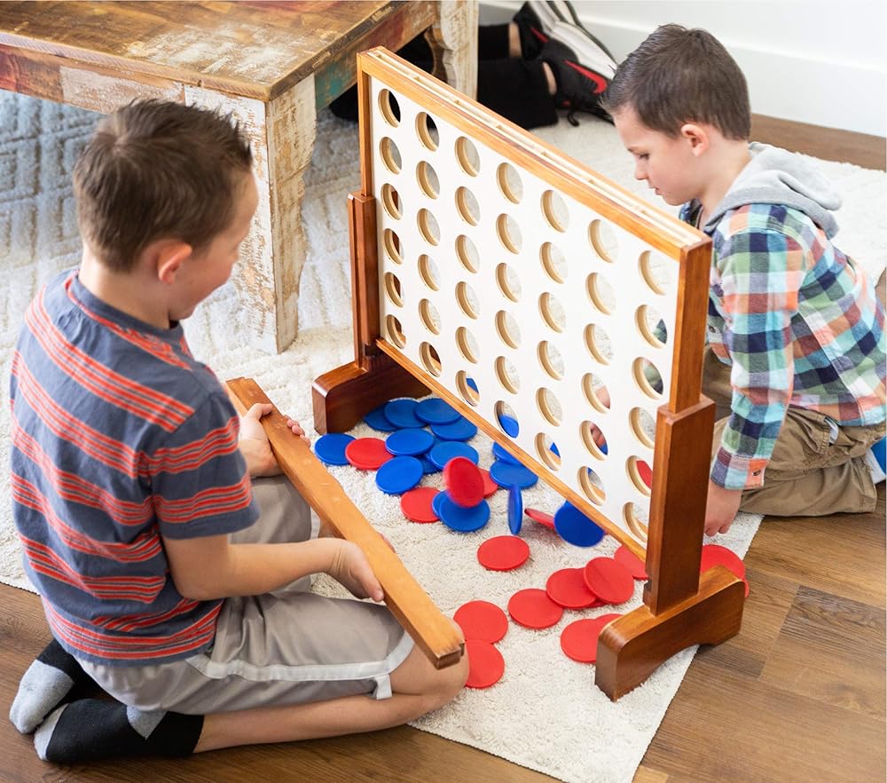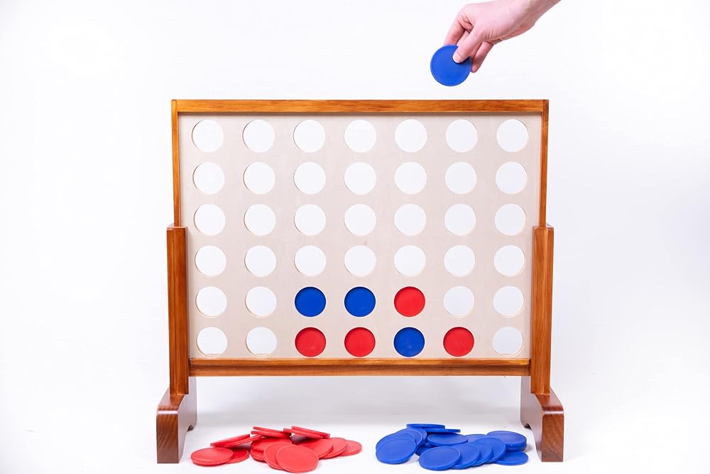 تشتمل على: لوح خشبي عملاق مقاس 31 × 23 بوصة، أرجل وإطار بلمسة نهائية جميلة، 21 عملة بلاستيكية حمراء و21 زرقاء مقاس 3 بوصة، وحقيبة حمل من النايلون