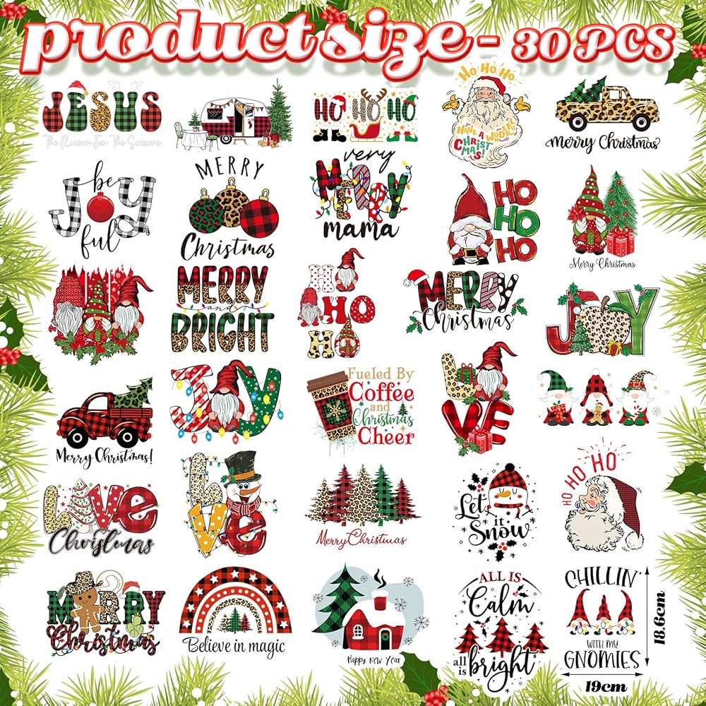 Zhanmai 30 قطعة من حديد عيد الميلاد على النقل للقمصان، مكواة حرارية على رقعات الفينيل، سانتا كلوز جنوم، ملصقات شجرة الحروف، شارات زينة لحقائب الملابس، قبعة DIY لوازم الديكور اليدوية