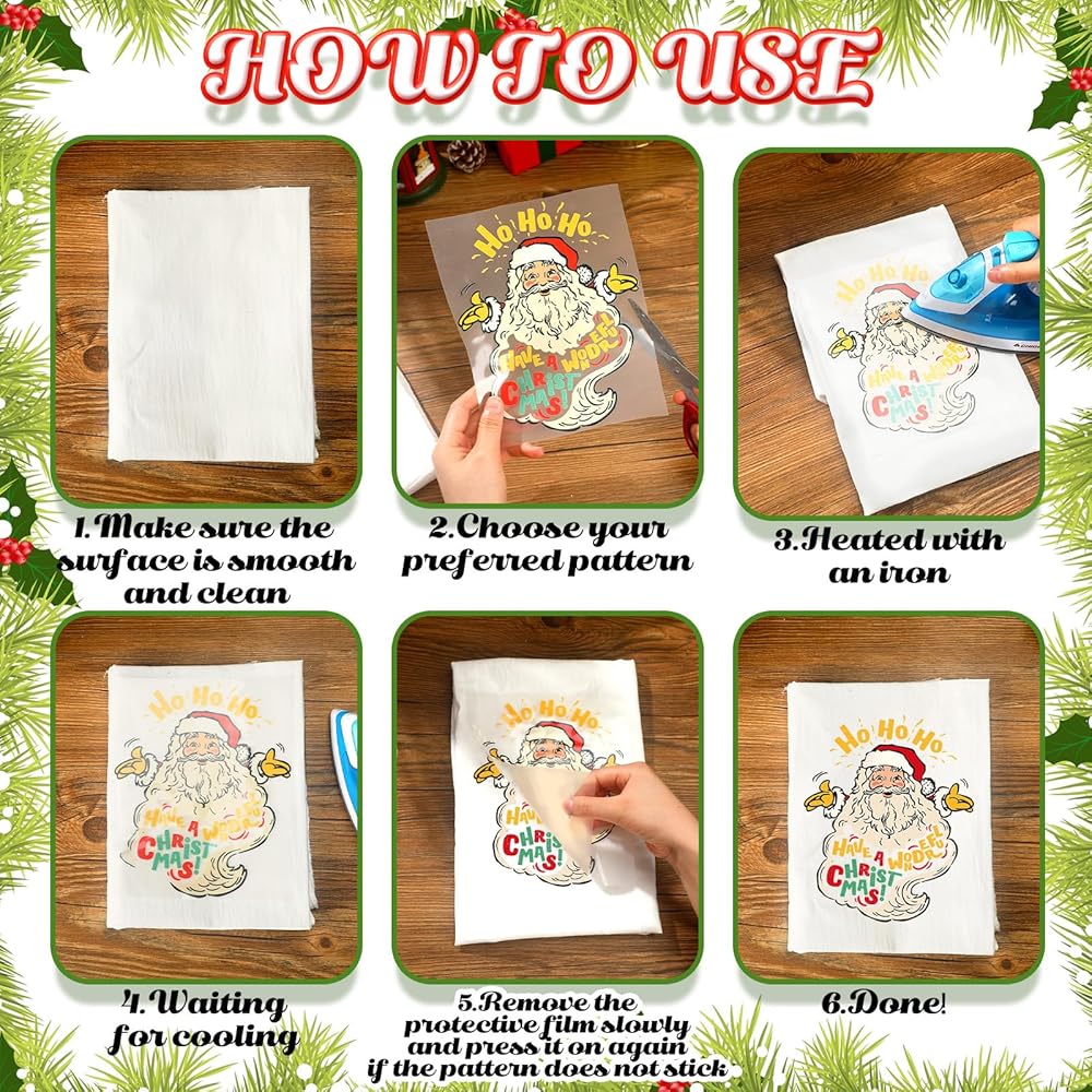 تطبيق واسع: لا تقتصر مكواة عيد الميلاد على ملصقات الفينيل على الملابس وحدها، بل يمكن وضعها على عناصر مختلفة مثل القمصان والحقائب والقبعات والسترات وأغطية الوسائد والمزيد؛ عبر عن إبداعك واحتفل بموسم عيد الميلاد من خلال تصميم ملابسك الخاصة لك ولعائلتك