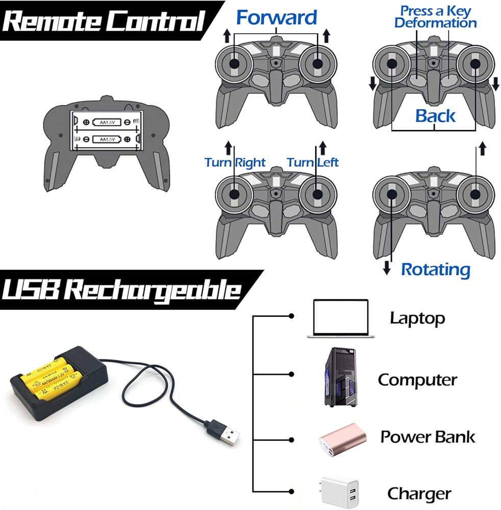 [متينة وآمنة] سيارة التحكم عن بعد للأولاد مصنوعة من مادة بلاستيك أكريلونتريل بوتادين ستايرين المتينة. جسم السيارة مضاد للسقوط، قوي ومقاوم للسقوط. غير سامة ومتينة وآمنة للأطفال. سوف ينجذب الأطفال على الفور مع ألعاب السيارات الروبوتية المتحولة هذه.