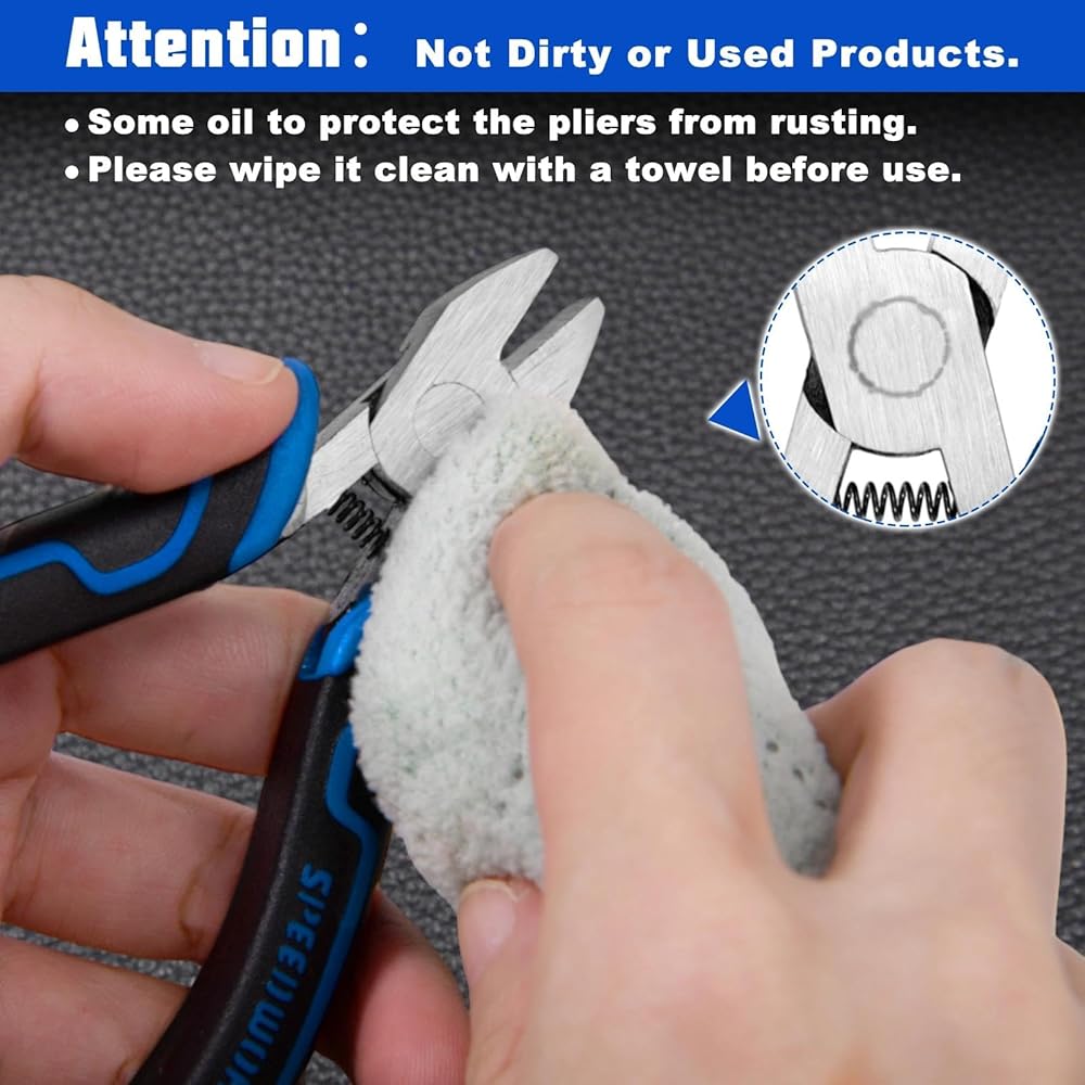 【زيت مضاد للصدأ】 قد يظهر زيت مضاد للصدأ على الكماشات، ويمكنه حماية الكماشات من الصدأ. إنها ليست منتجات متسخة أو مستخدمة، يمكنك تنظيفها بمنشفة ولن تؤثر على الوظيفة.