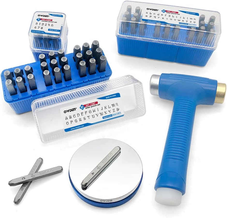 مجموعة ختم معدنية من أودين بروفيشينال، مجموعة واحدة 27 قطعة. مجموعة لكمة حروف كبيرة فنية ومجموعة واحدة 27 قطعة. مجموعة صغيرة من حروف الخط الفنية ومجموعة 1 9 قطع. مجموعة لكمة رقم الخط الفني. قطعة واحدة. مطرقة حرفية 3 في 1 وقطعة واحدة. مكعب معدني للمقعد