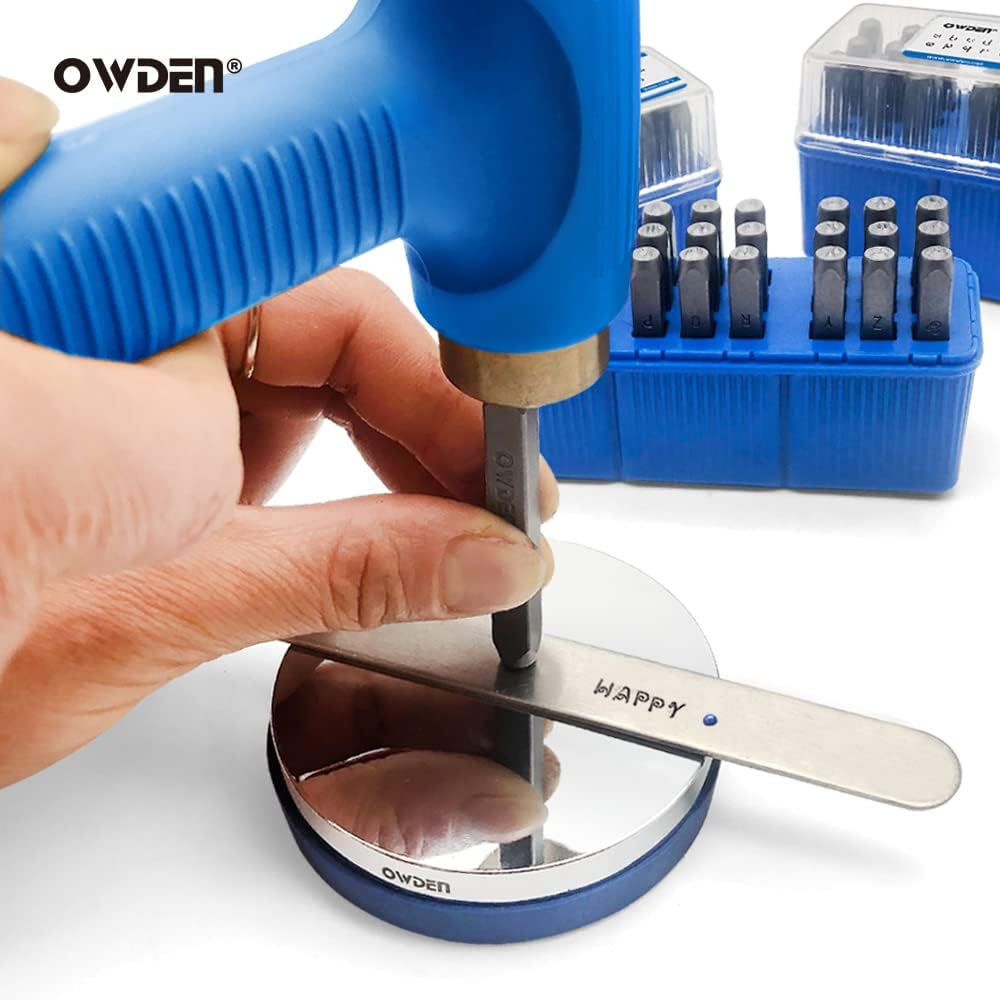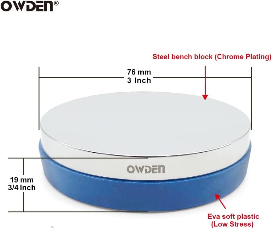 أويدين مصممة من الفولاذ المقاوم للصدأ لصناعة المجوهرات DIY وختم المعادن حجم كتلة المقعد المعدني: قطر 7.62 سم وارتفاع 1.90 سم. الجزء الصلب مصنوع من سبائك الفولاذ ، الجزء الصلب مصنوع من مرآة مطلية بالكروم. (لا تصميم مقاوم للانتعاد). الجزء السفلي مصنوع من البلاستيك الناعم ويلتف الجزء السفلي من الجزء الصلب. الجزء السفلي الناعم يساعد على تقليل قوة الارتداد عند الضغط. ستجعل الأنماط أو الأحرف التي نعمل عليها أكثر خطوباً.