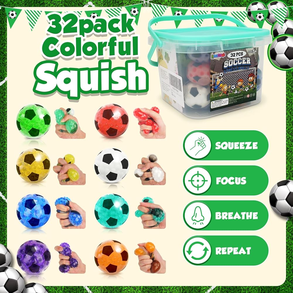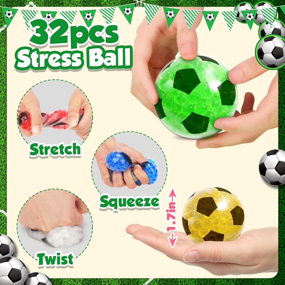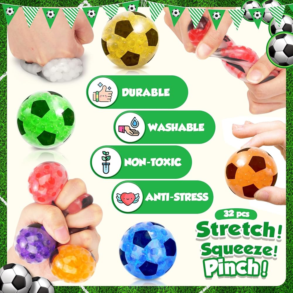 🏆 Versatile Rewards and Party Favors: With 32 mini stress balls in this kids prize set, the possibilities are endless! Teachers can use them as motivating classroom rewards, encouraging students to excel and participate actively. Additionally, squishy soccer balls are perfect additions to goody bags at parties, spreading joy and stress relief to all guests.