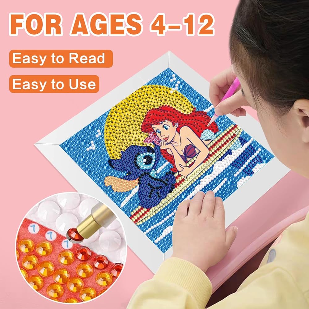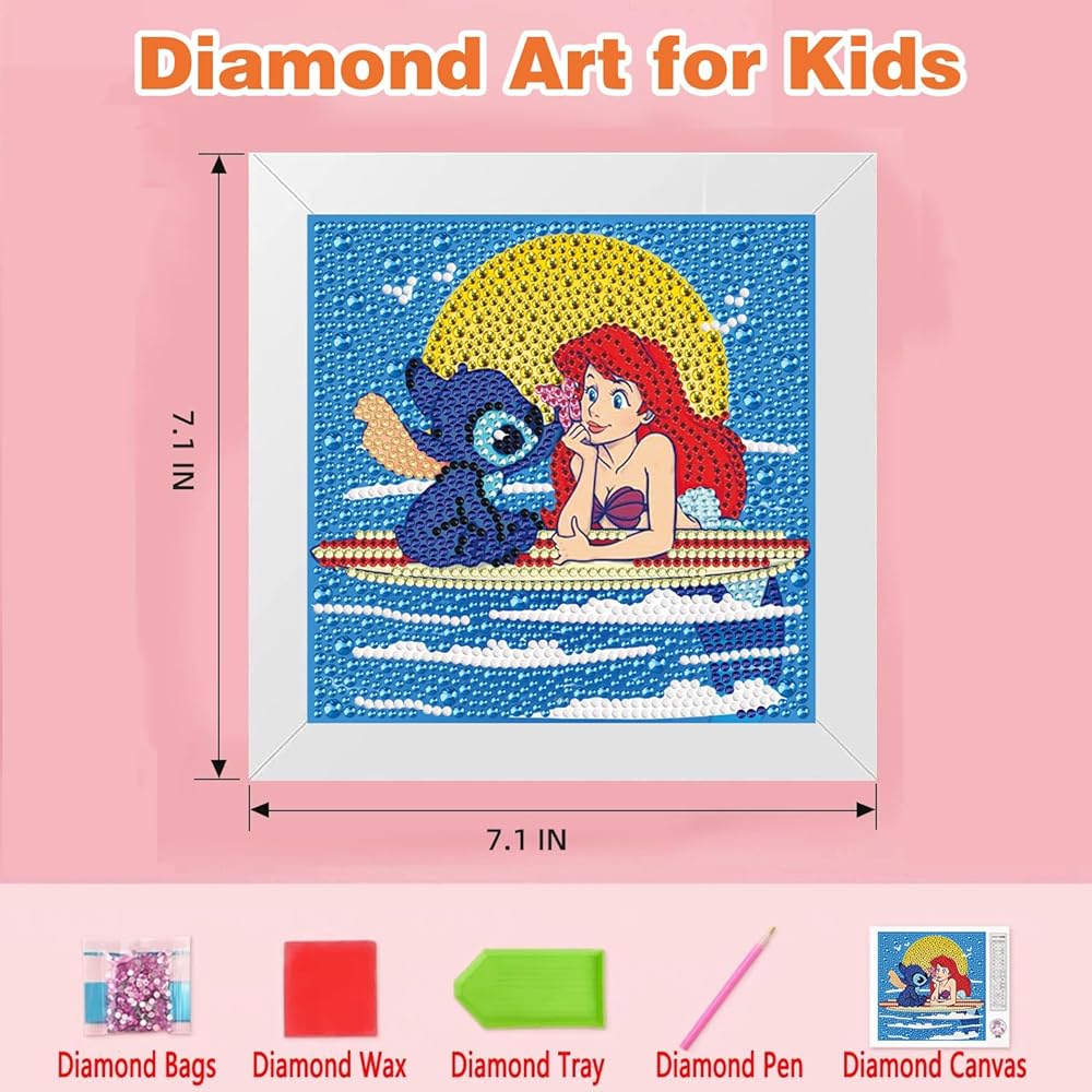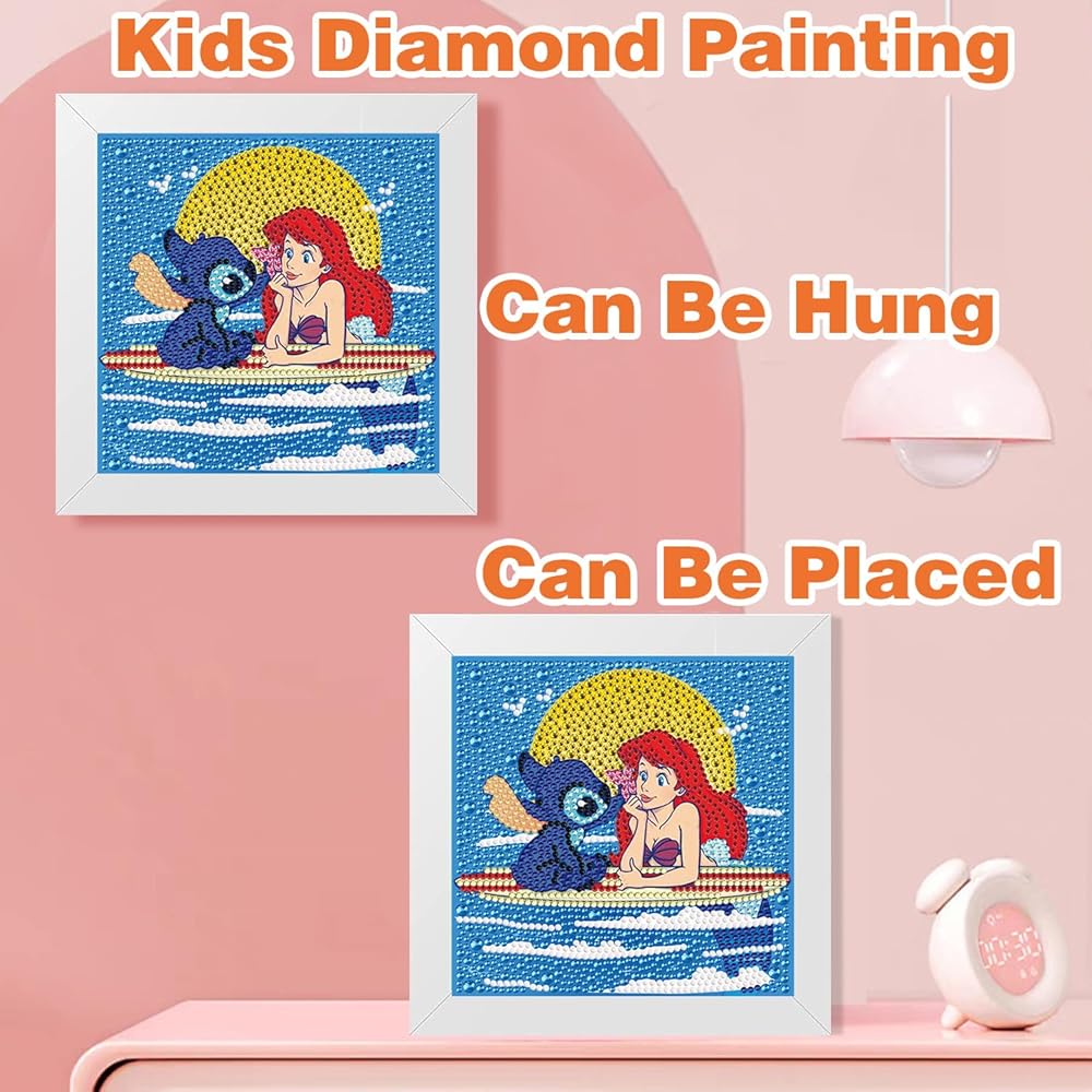 Stitch Diamond Painting for Kids, 5D Princess Diamond Art Mini Small Kit with Frame, DIY Cute Cartoon Big Gem Painting Set, Paint by Diamonds Crafts for Girls Boys Ages 4-12,Stitch and Princess Gem Art Kits 6X6 inch