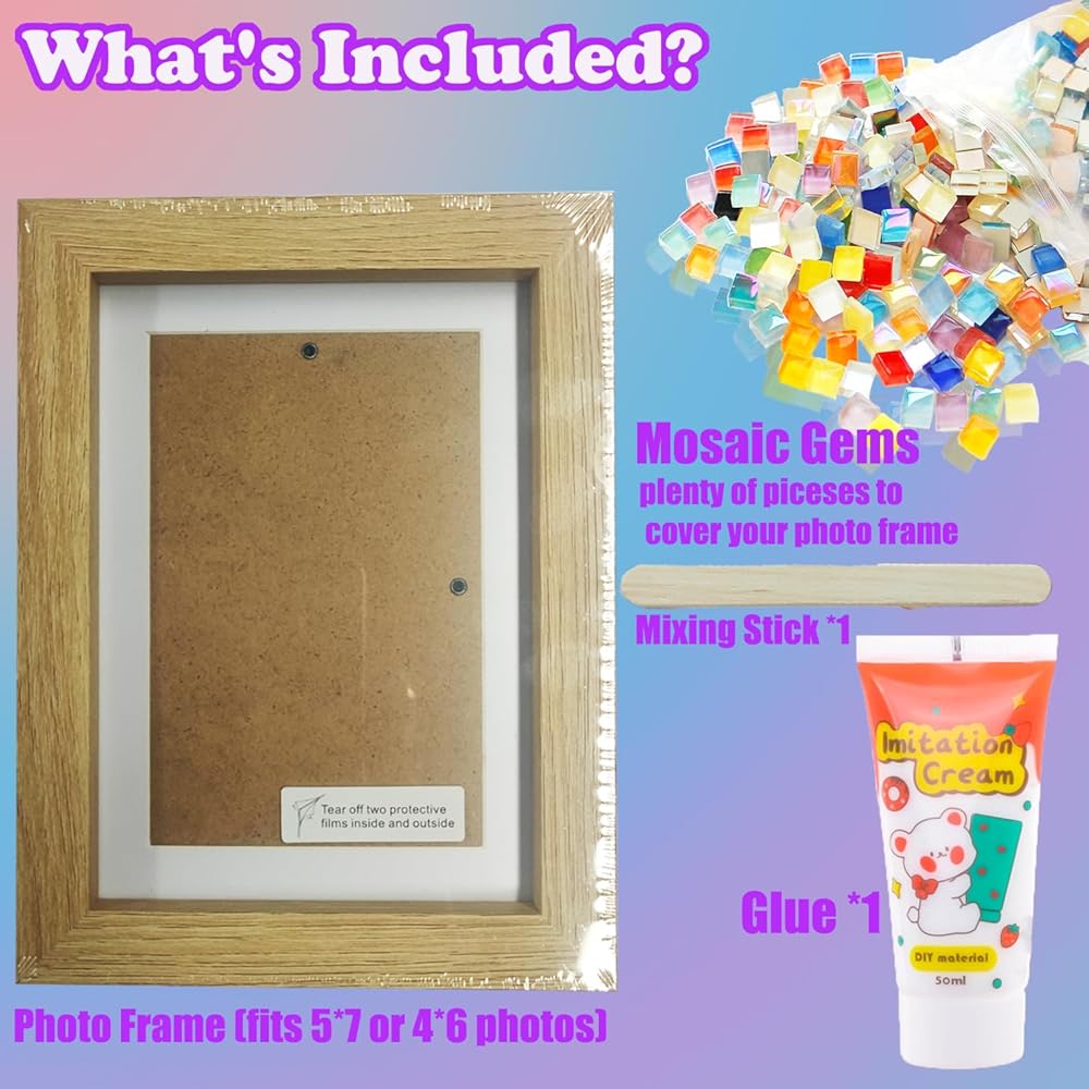 Mosaic Picture Frame Kit: The set includes a wooden photo frame that will hold a 4x6" (10x15 cm) or 5x7" (13x18 cm) photo, 120g of multicolor mosaic stones, cream glue and a spreader stick. You can use it horizontally or vertically. You can hang the finished photo frame on the wall or place it on the desktop. Shelves, mantle and other places, it is also a very good decoration.