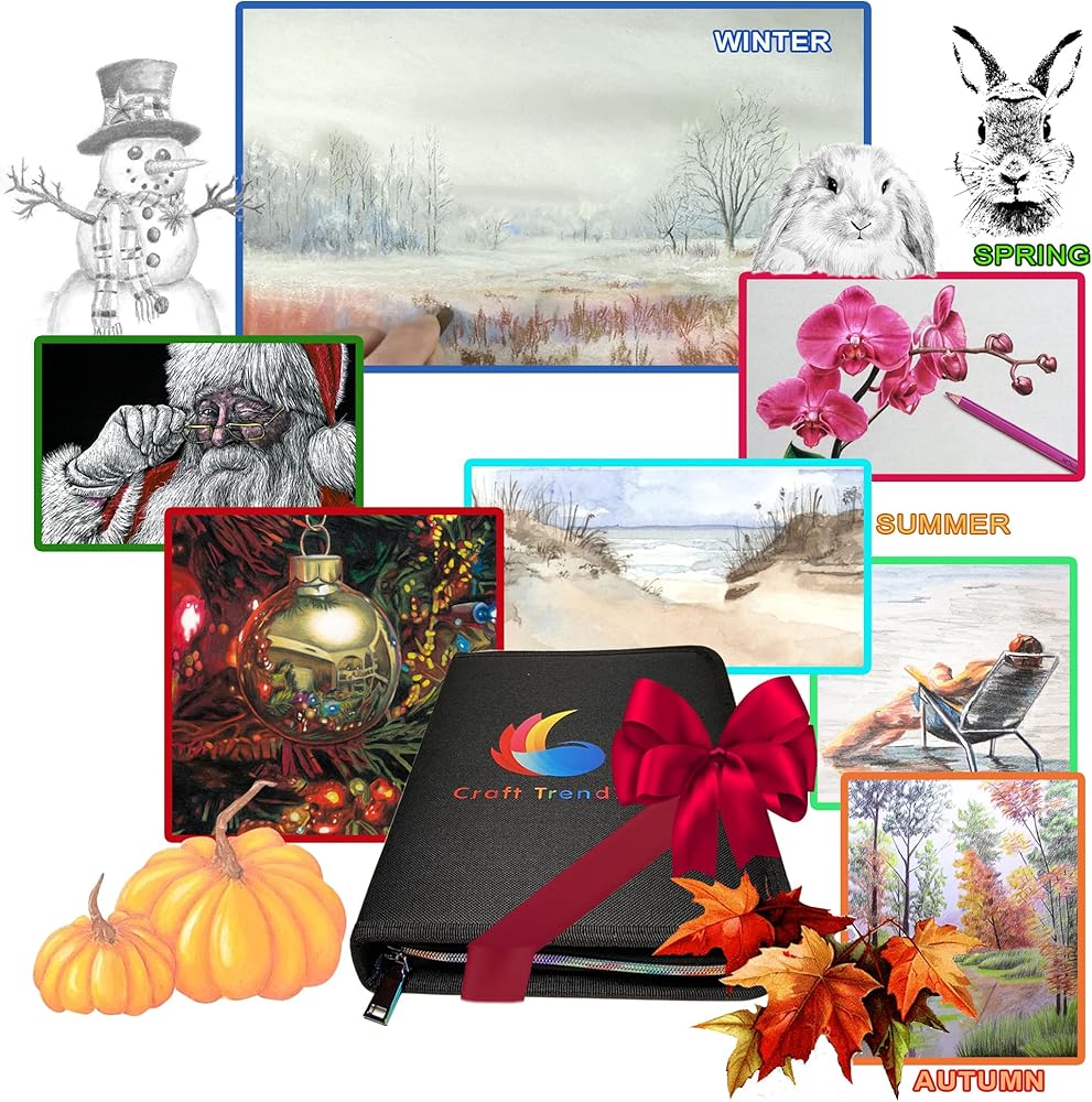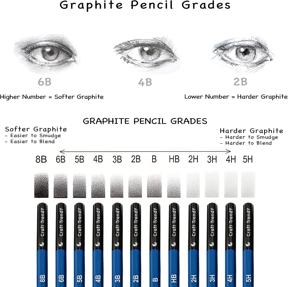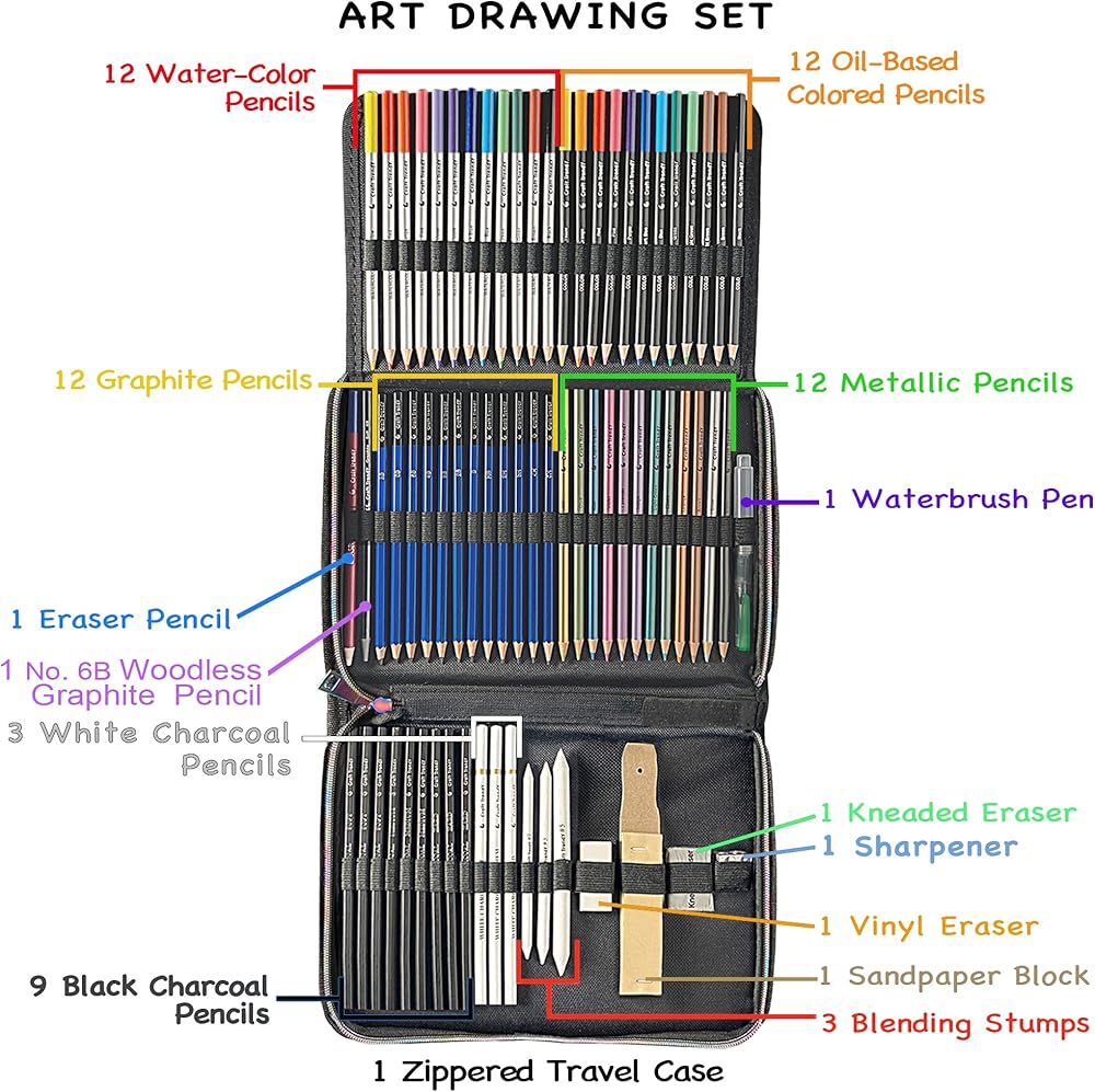 أدوات الرسم: كن مبدعًا مع 12 قلم رصاص ملون نابض بالحياة قائم على الزيت، 12 قلم رصاص معدني، 12- ألوان مائية 12- أقلام رسم جرافيت بما في ذلك؛ (6H,4H,3H,2H,HB,B,2B,3B,4B,5B,6B,8B) 1- أقلام رصاص ممحاة، 1-6B أقلام جرافيت بدون خشب (ناعمة 6B. 9- 9- الفحم الأسود أقلام رصاص (ناعمة ومتوسطة وصلبة)، 3 أقلام فحم بيضاء (ناعمة ومتوسطة وصلبة)، 3- جذع مزج الورق، 1- ممحاة فينيل، 1- مبراة، 1 ممحاة عجن، 1 كتلة ورق صنفرة، 1 قلم فرشاة مائي.