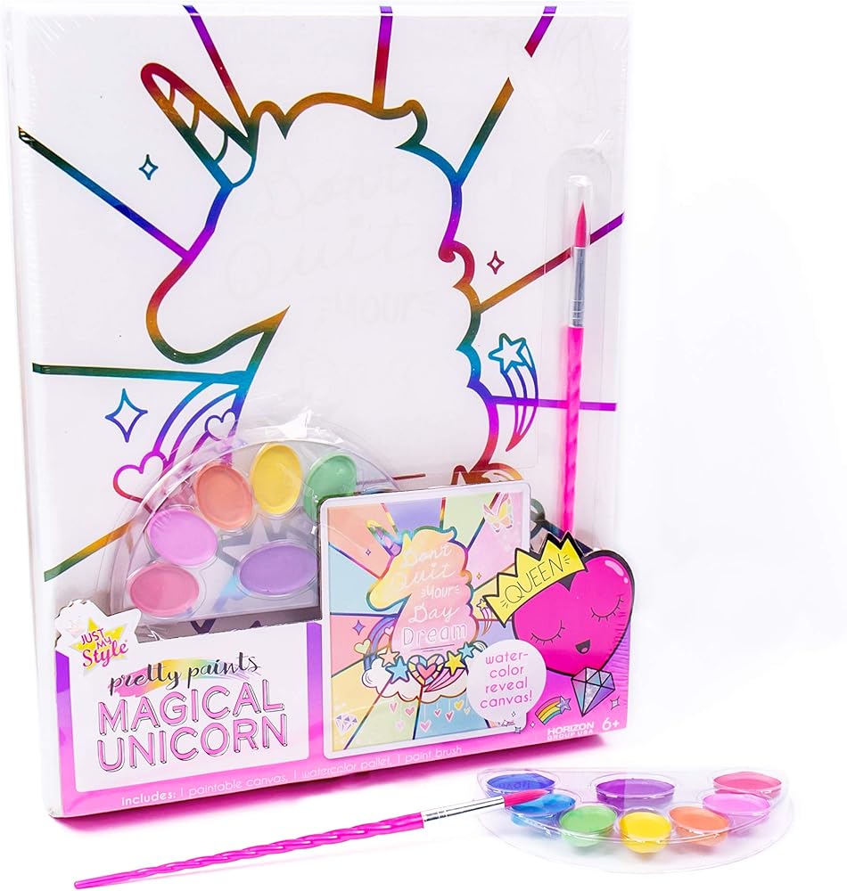• قماش مطبوع مسبقًا وكشف مفاجئ عن الألوان المائية: يأتي قماش Just My Style Magical Unicorn بتصميمات يونيكورن مطبوعة مسبقًا - بما في ذلك الكشف المفاجئ عن الألوان المائية - مما يجعل من السهل على الرسامين الصغار الحصول على الإلهام أثناء رسم الأشكال والرسومات التفصيلية!
