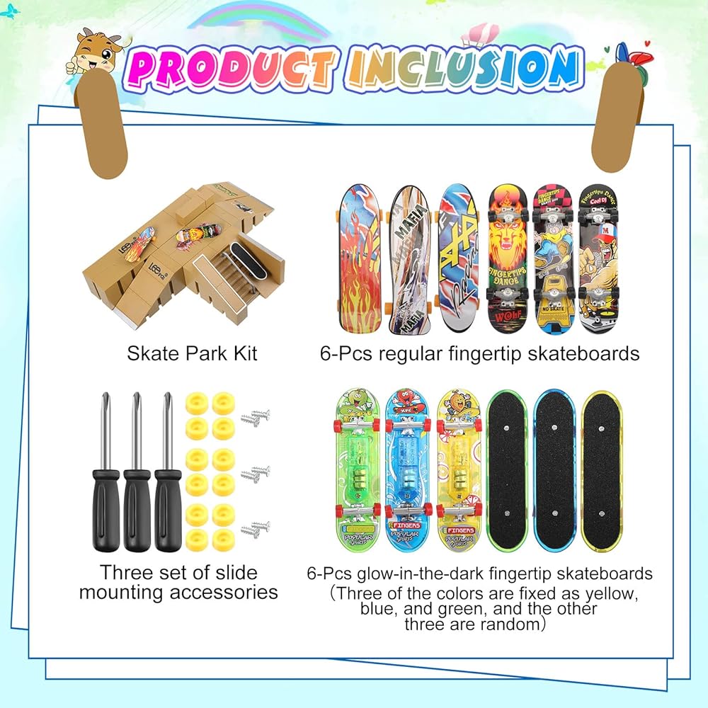 منحدر لوح التزلج ومجموعة لوح التزلج بالأصابع: ستحصل على منحدر واحد للوح التزلج حوالي 16.53 × 11.41 انش، 3 مجموعات من مجموعات استبدال عجلات لوح التزلج، 3 ألواح تزلج غير منتظمة الشكل للأصابع و6 ألواح تزلج مضيئة للأصابع، ستحصل بالتأكيد على لوح تزلج مضيء واحد باللون الأزرق والبرتقالي والأخضر، وسيتم خلط ألواح التزلج الثلاثة المضيئة المتبقية بشكل عشوائي بهذه الألوان الثلاثة