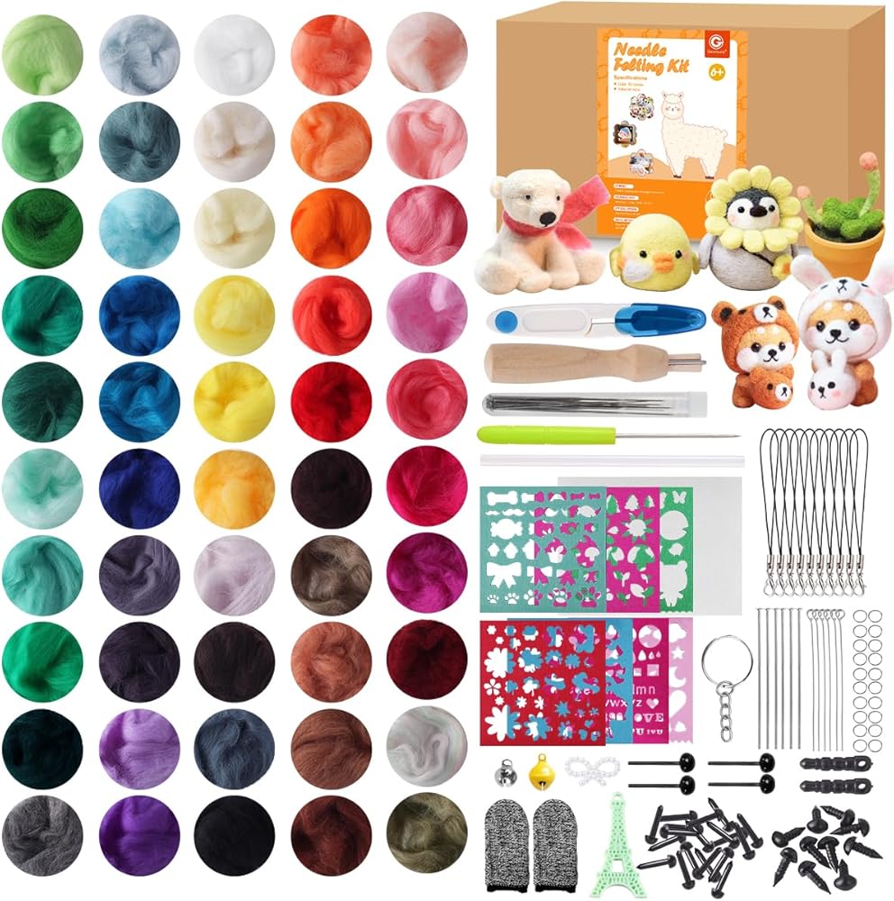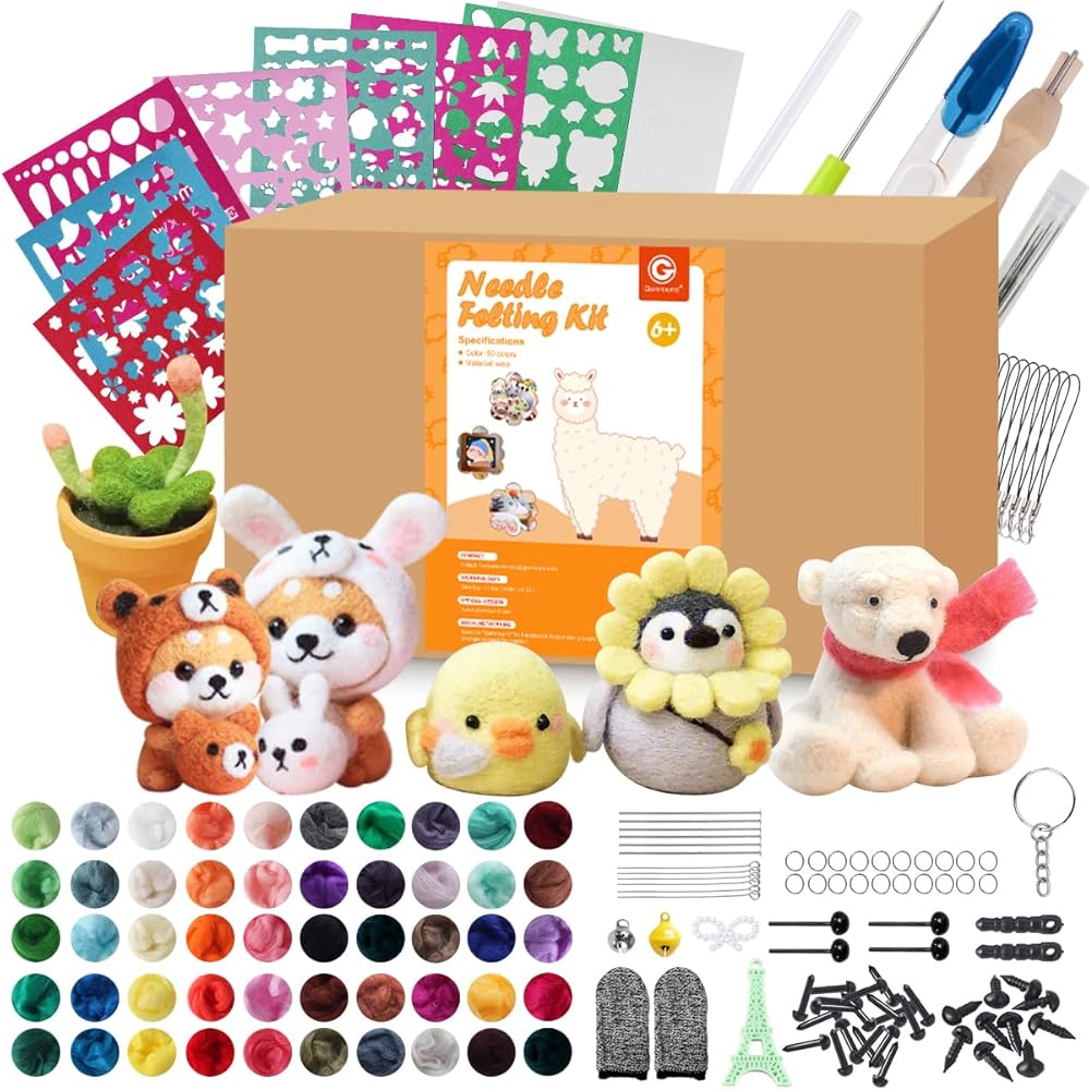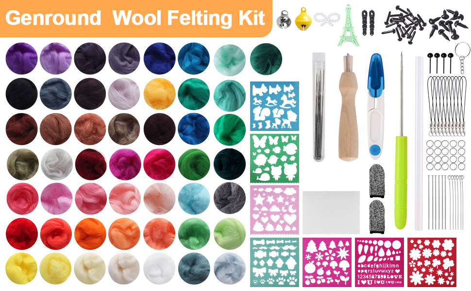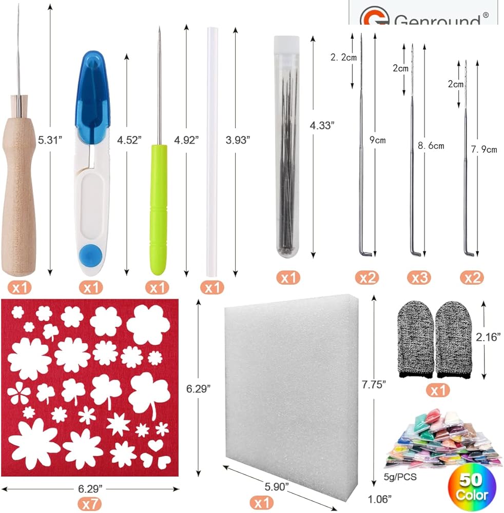 مجموعة أدوات التلبيد بالإبرة المكونة من 50 لونًا من Genround، مجموعة أدوات التلبيد الكاملة من الصوف، مجموعة أدوات التلبيد الكاملة من أدوات اللباد الصوفية مع لوازم التلبيد بإبرة الحيوانات حرفة غزل ألياف الصوف للمبتدئين