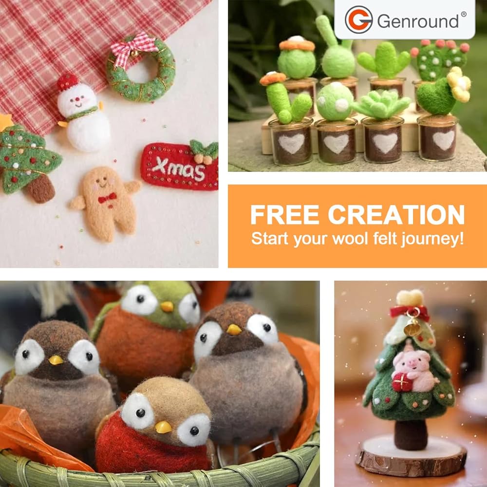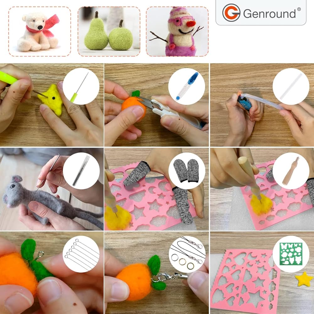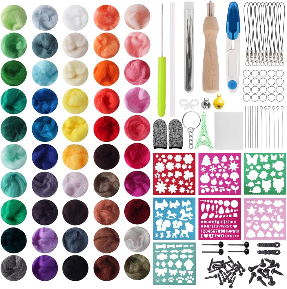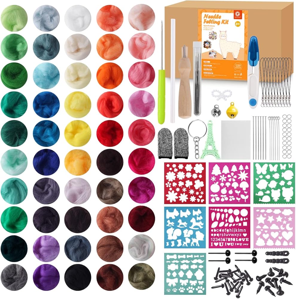 مجموعة أدوات التلبيد بالإبرة المكونة من 50 لونًا من Genround، مجموعة أدوات التلبيد الكاملة من الصوف، مجموعة أدوات التلبيد الكاملة من أدوات اللباد الصوفية مع لوازم التلبيد بإبرة الحيوانات حرفة غزل ألياف الصوف للمبتدئين