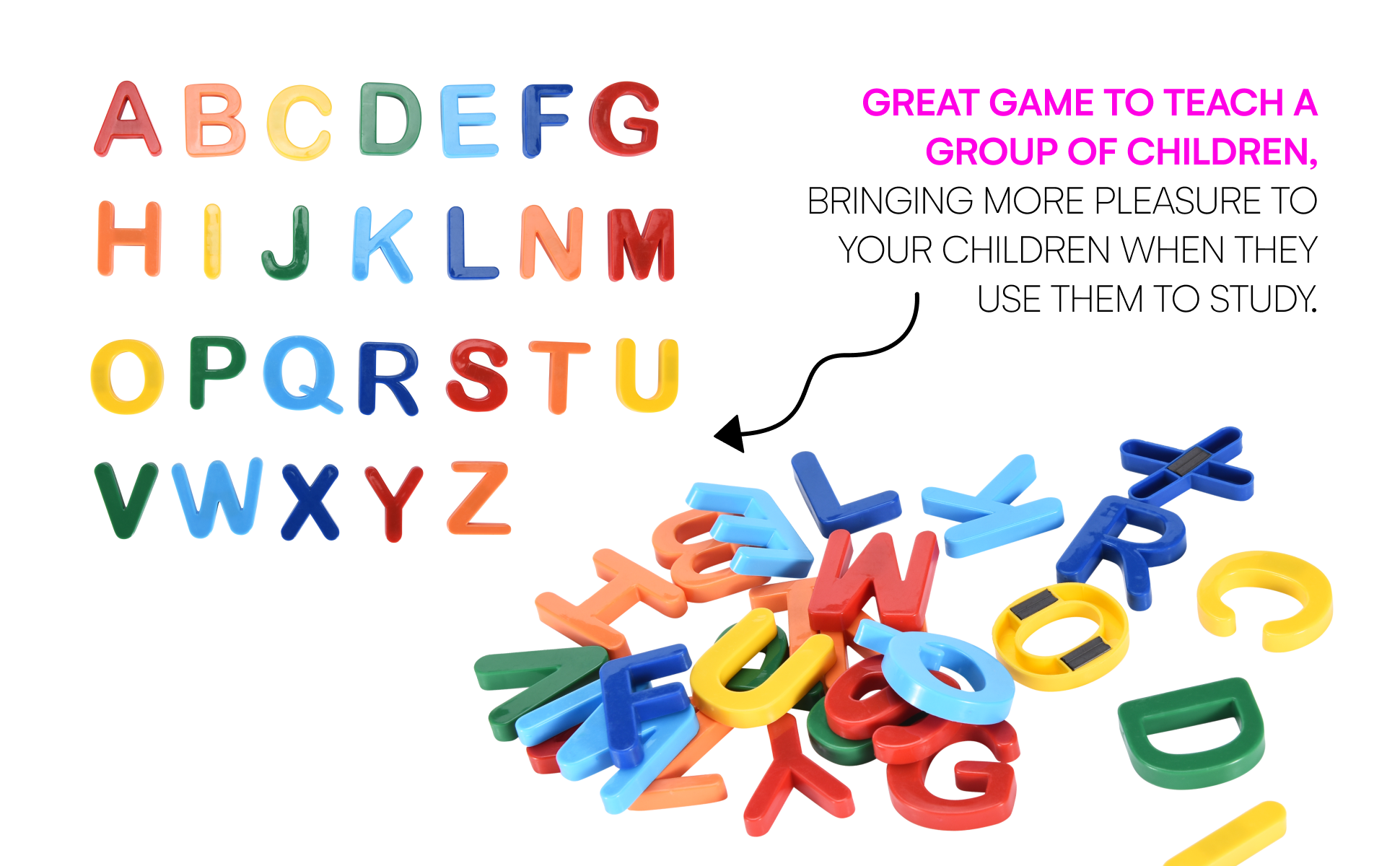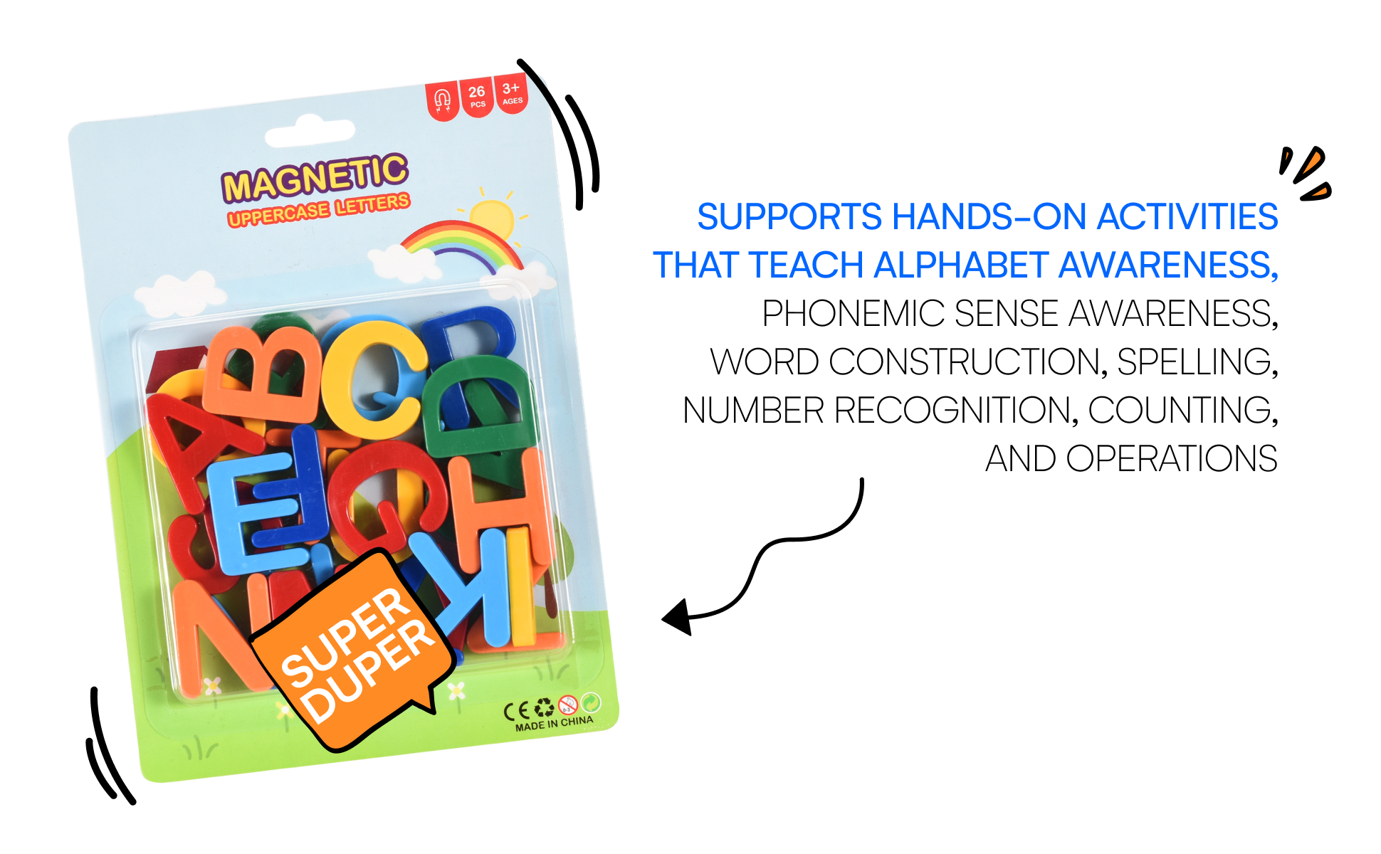 كما أن هذه الحروف خفيفة الوزن وصغيرة الحجم مع حواف ومنحنيات ناعمة، مما يسهل على الأيدي الصغيرة الإمساك بها. وهذا يدعم الأنشطة العملية التي تعلم الوعي بالحروف الأبجدية، والوعي بالمعنى الصوتي، وبناء الكلمات، والتهجئة.