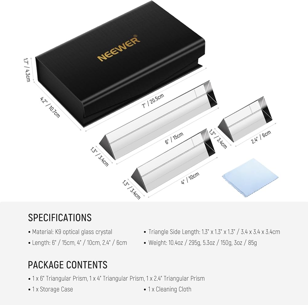 • 【Package Contents】 1 x 6"/15cm Triangular Prism, 1 x 4"/10cm Triangular Prism, 1 x 2.4"/6cm Triangular Prism, 1 x Storage Case, 1 x Cleaning Cloth