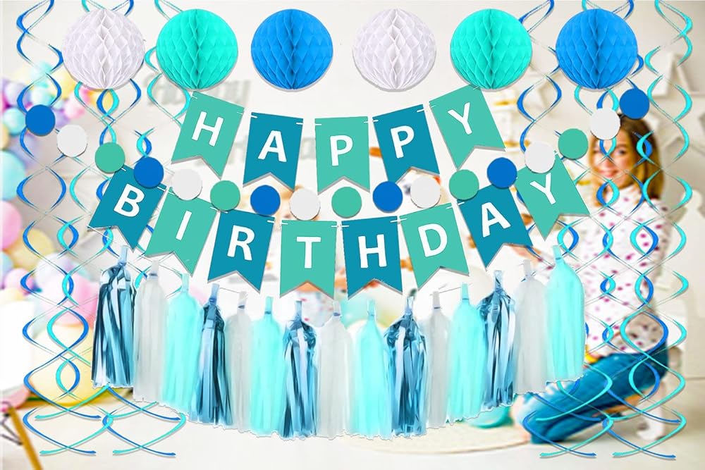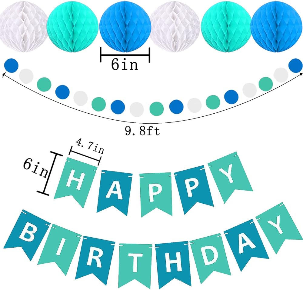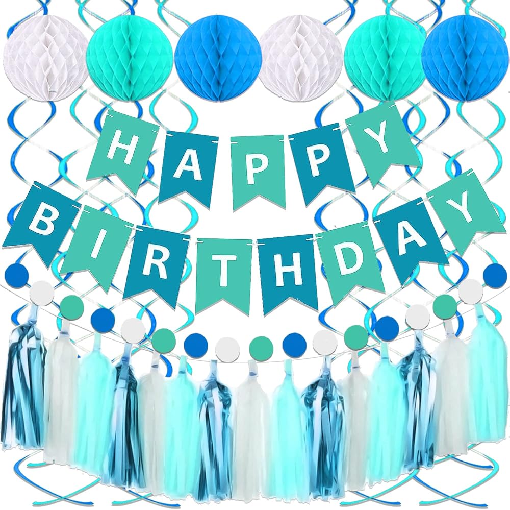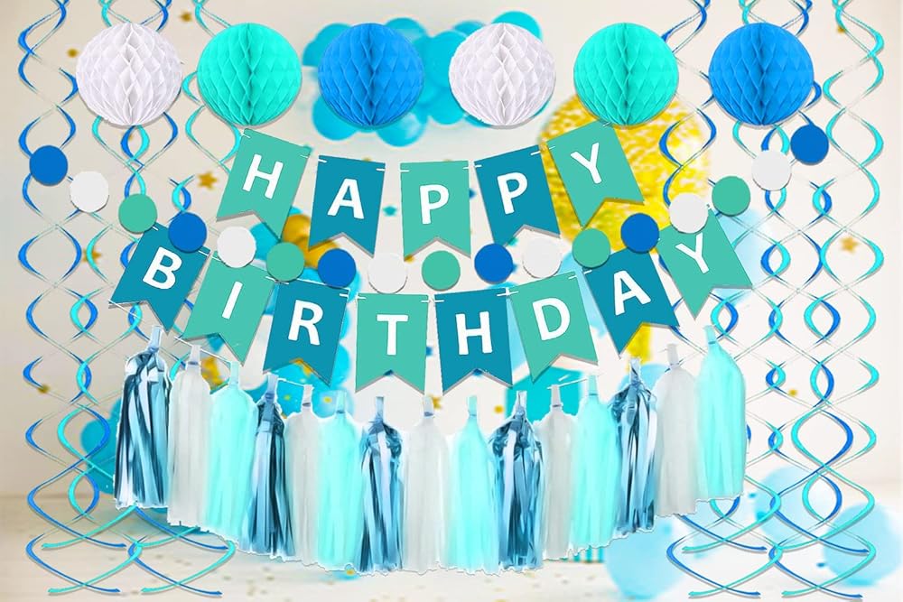 زخارف حفلة عيد ميلاد زرقاء، لافتة عيد ميلاد سعيد زرقاء لزينة أعياد ميلاد الأطفال، شرابات ورقية زرقاء، كرات على شكل قرص العسل، دوامات للأولاد والبنات، لوازم زينة عيد ميلاد العائلة