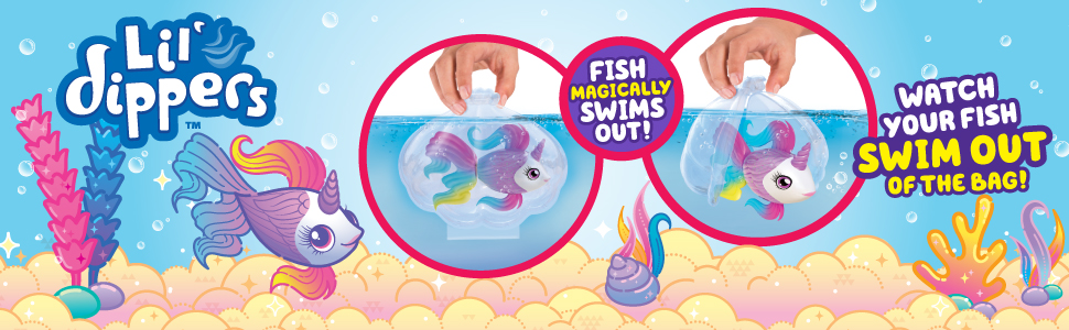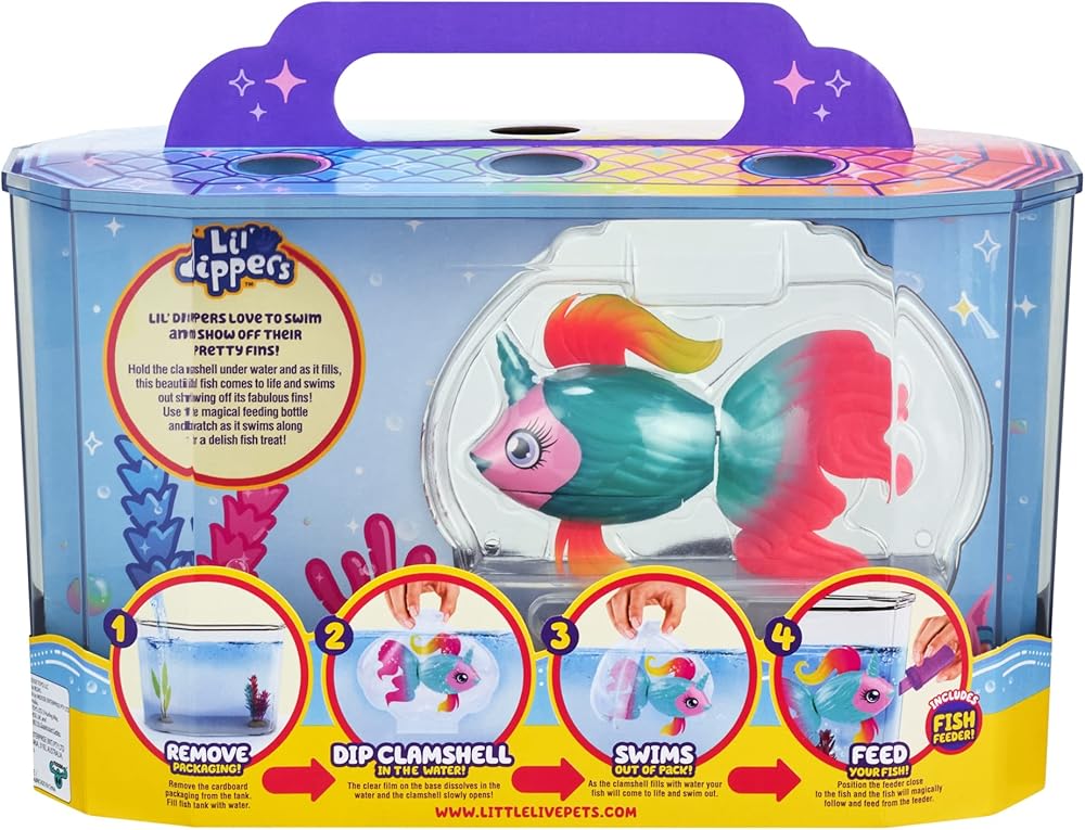 جديدة من ليتل لايف بيتس، ليل ديبرز هي مجموعة من الأسماك الجميلة والتفاعلية التي تحب السباحة وإظهار زعانفها الجميلة! يعتبر حوض السمك ليل ديبرز هو المنزل المثالي المرح لجميع أفراد ليل ديبرز. تتضمن هذه الحزمة Lil' Dipper الحصرية - تعرف على Fantasea، السمكة الأنيقة ذات طابع وحيد القرن. أمسك صدفة البطلينوس تحت الماء وعندما تمتلئ، شاهد فانتازيا تنبض بالحياة بطريقة سحرية وتسبح خارج الحقيبة! استخدمي زجاجة الرضاعة السحرية وشاهدي بينما تسبح فانتاسيا وتابعيها للحصول على وجبة لذيذة من الأسماك. تشتمل هذه الحزمة على (1) خزان أسماك، (2) ملحقات خزان، (1) سمكة، (1) أداة تغذية، (3) بطاريات LR44، و(1) كتيب تعليمات. هذا المنتج مثالي للأطفال من سن 5 سنوات فما فوق. انغمس في عالم Lil' Dippers السحري، حيث تلتقي المياه بالغرابة!