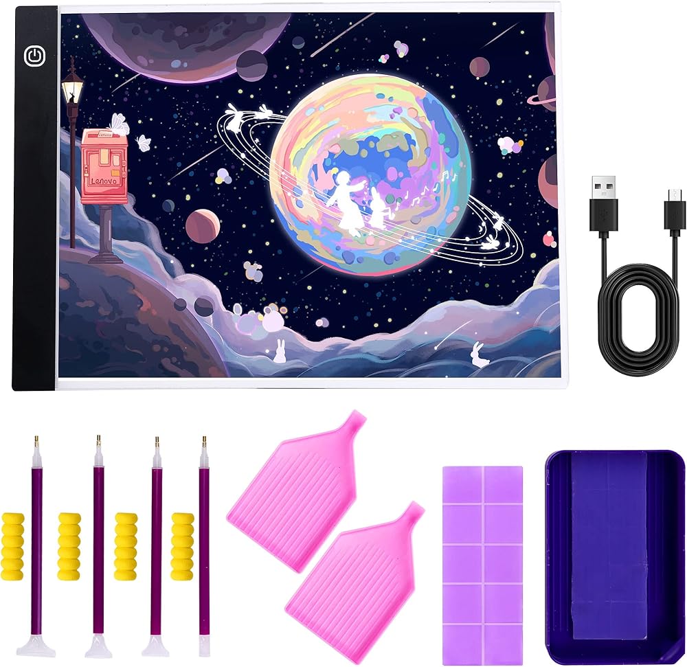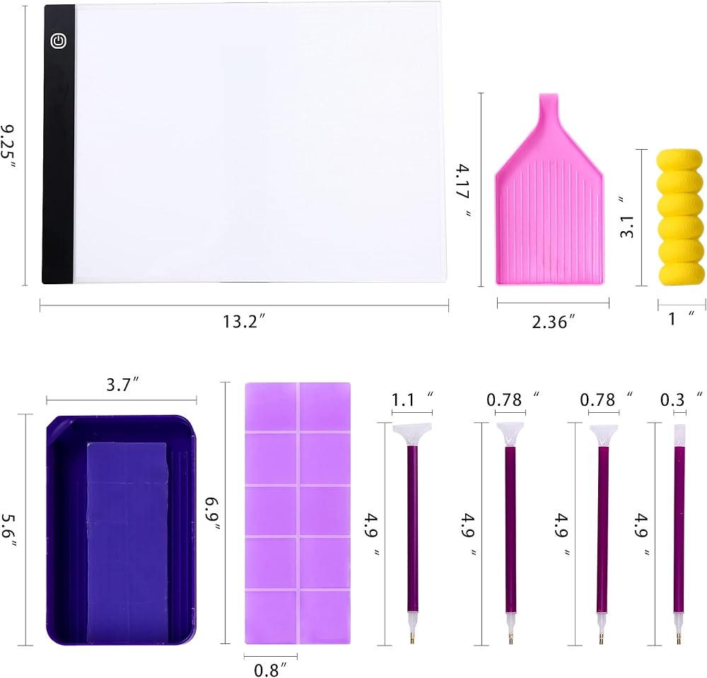 【Great Diamond Painting Accessories】Our diamond painting light board kits include a A4 light pad, USB cable, 4 diamond painting pens, trays, wax.