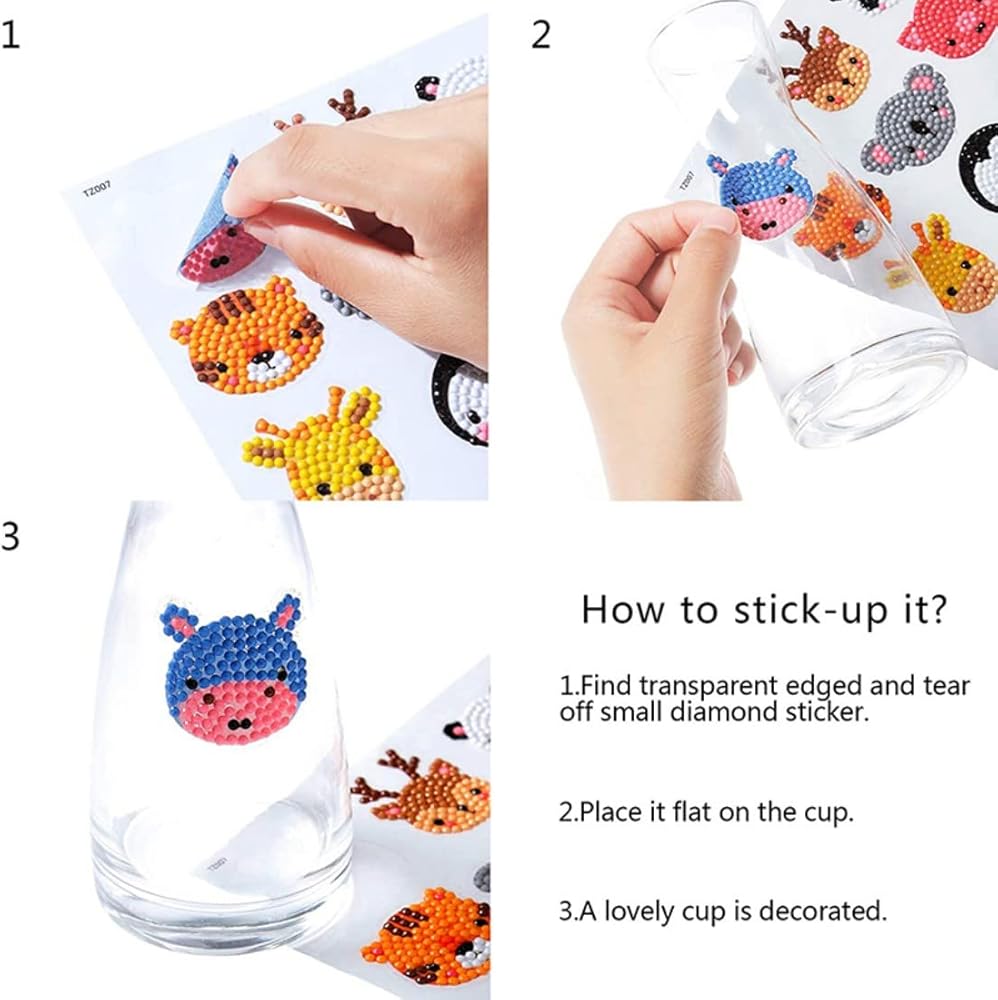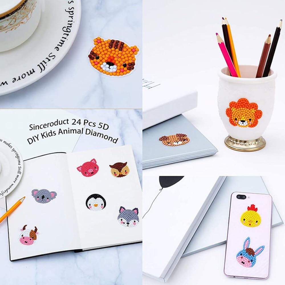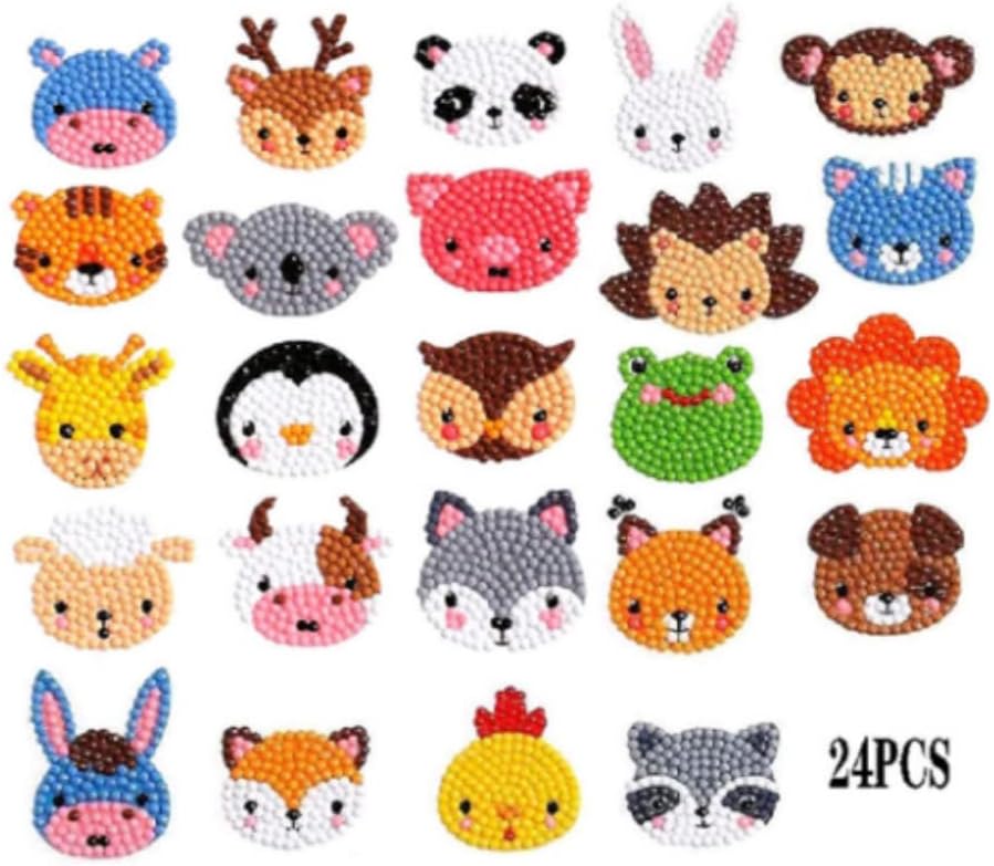 24 kinds of cartoon animals: Our 5D Diamond Painting Stickers provide you with 24 different kinds of cartoon animals with vivid and lovely colors to meet all the needs of children. We provide accessory tools to make the whole sticker. A set of diamond drawing tools include clay, pen, tray and diamond. The diamond stickers have a variety of bright colors, which makes the diamond stickers sparkling and very cute, and let children create their own diamond stickers.