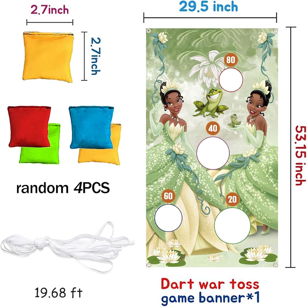 【Princess and The Frog Toss Game】This package includes 135 * 75 cm (53.15 *29.5 inches) Princess Tiana party games banner, 6-meter ribbon and 4 bean bags.