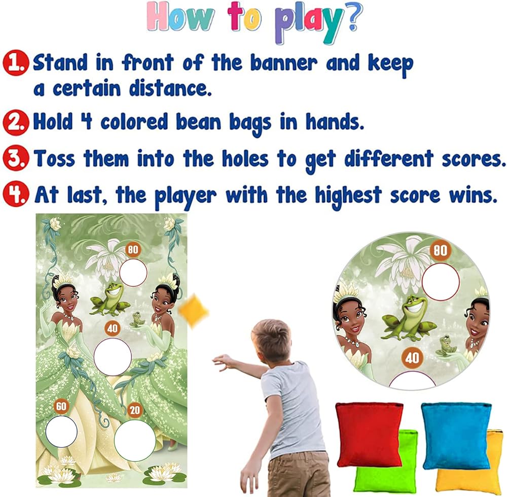 【Material】The Tiana toss banner is made of high-quality fabrics with bright and clear patterns. The corners are equipped with 4 metal round holes for fixing the ropes. They can be hung wherever you want to hang. The bean bags are made of comfortable and strong fabrics, which are safe, firm and durable.