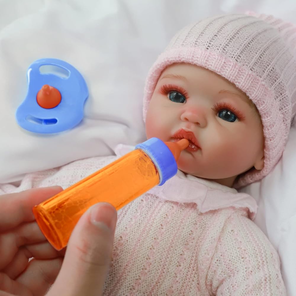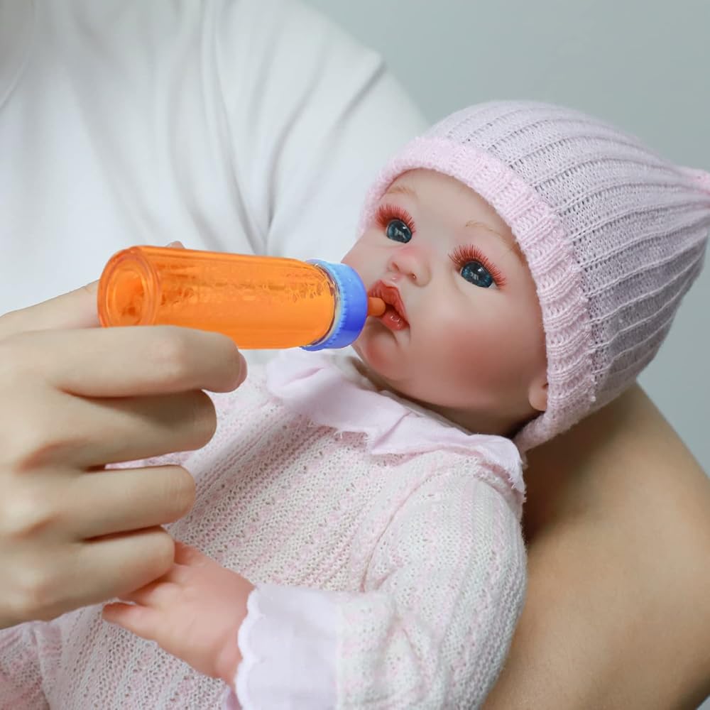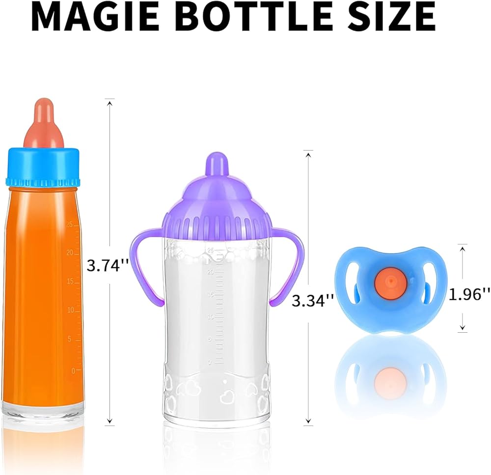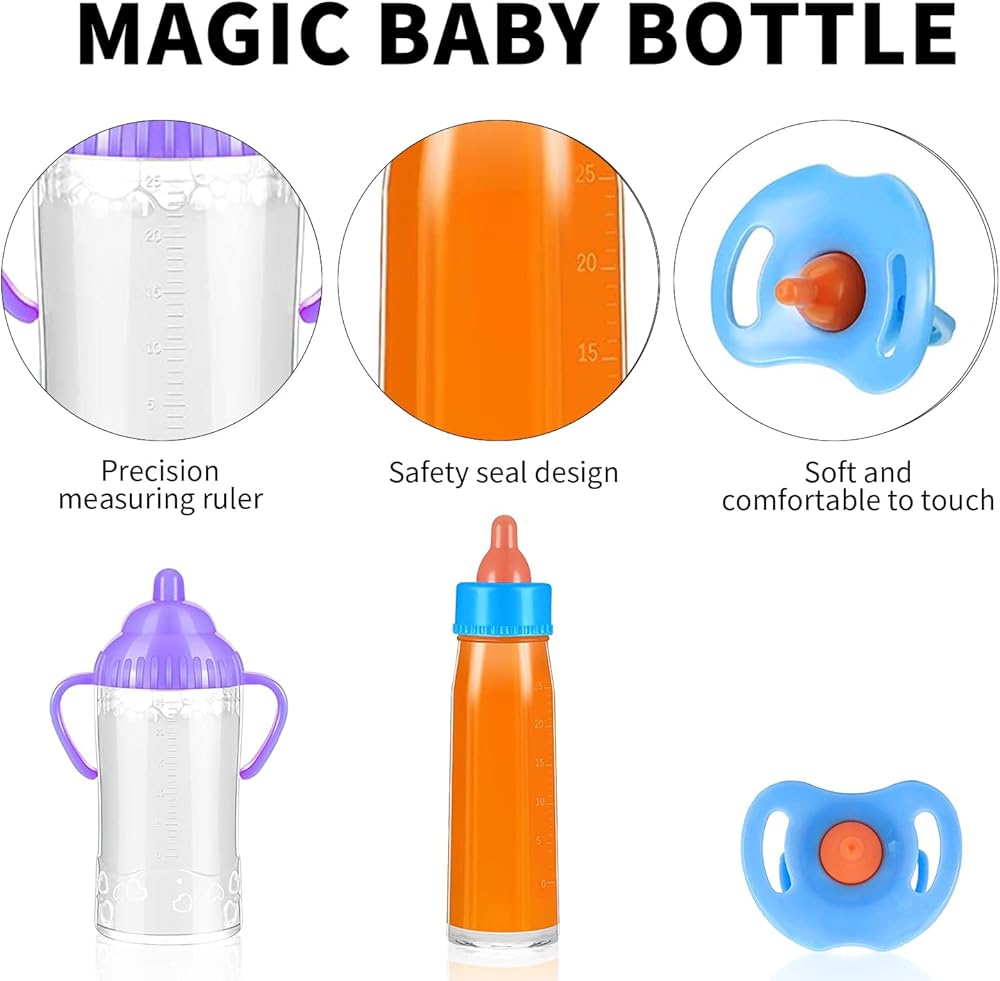 زجاجات الأطفال السحرية للدمى. عبوة واحدة تحتوي على زجاجتين من العصير والحليب. تبدو هذه الزجاجات البلاستيكية خفيفة الوزن وكأنها فارغة عندما تشرب الدمية المولودة حديثًا، مما يثير الخيال ويوفر ساعات من المتعة.