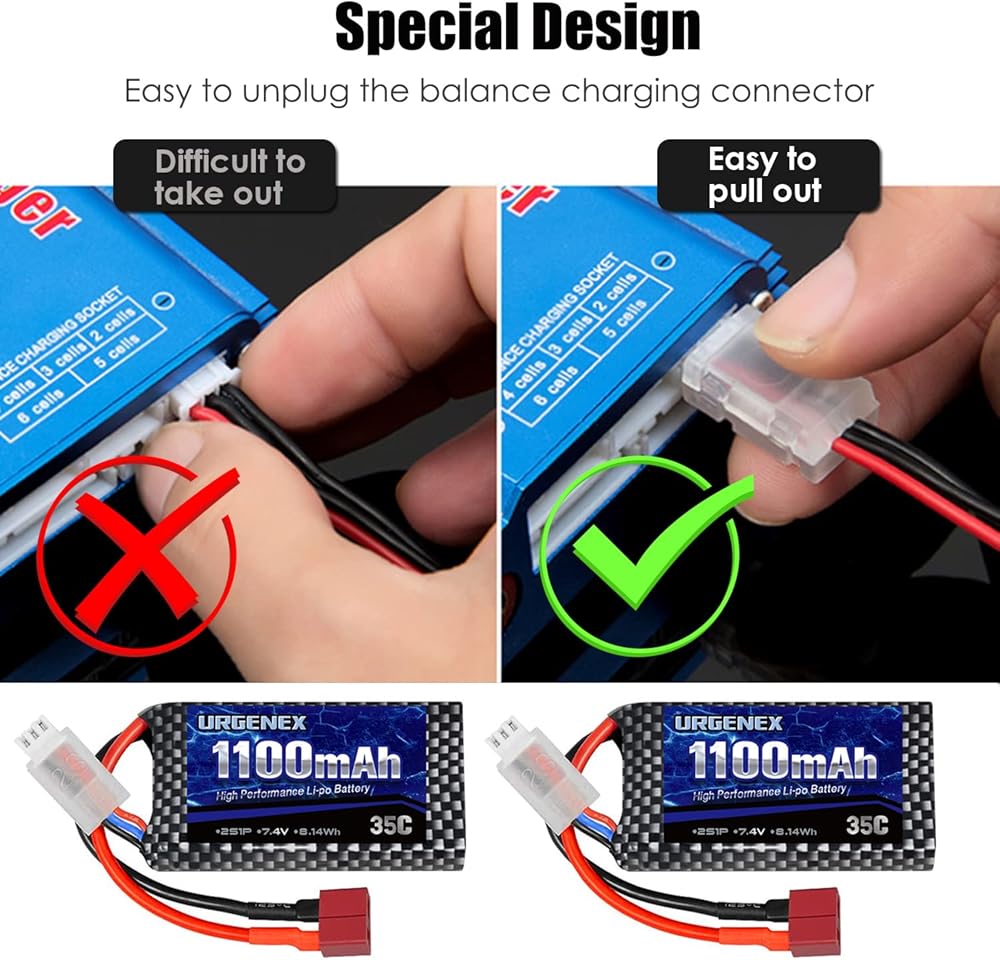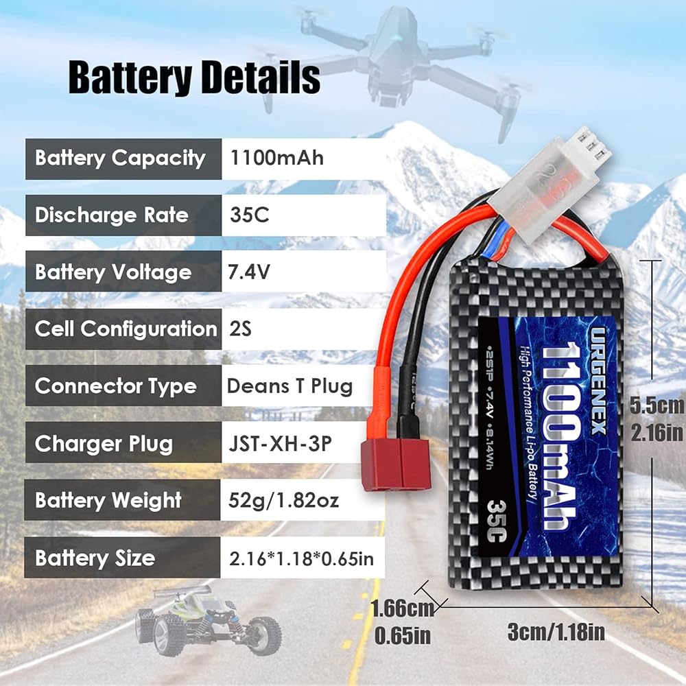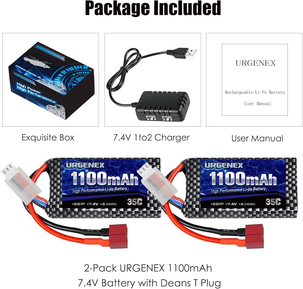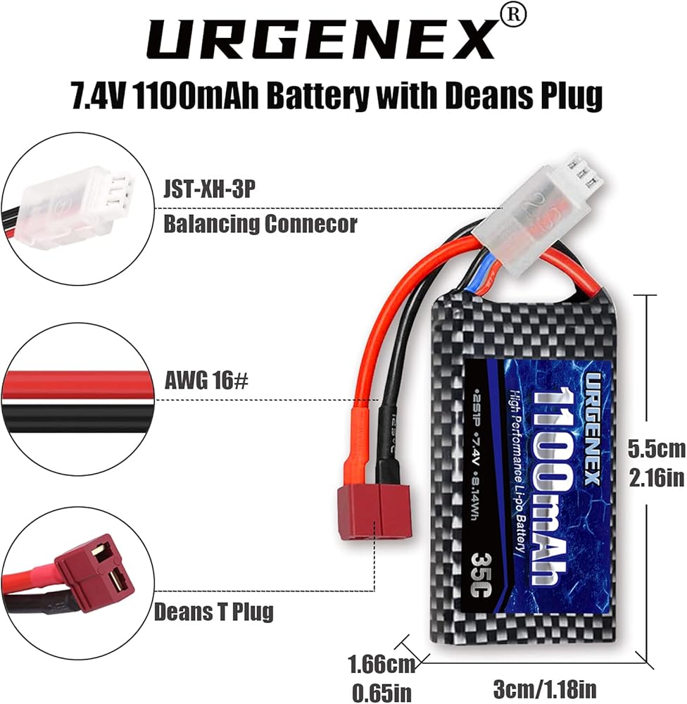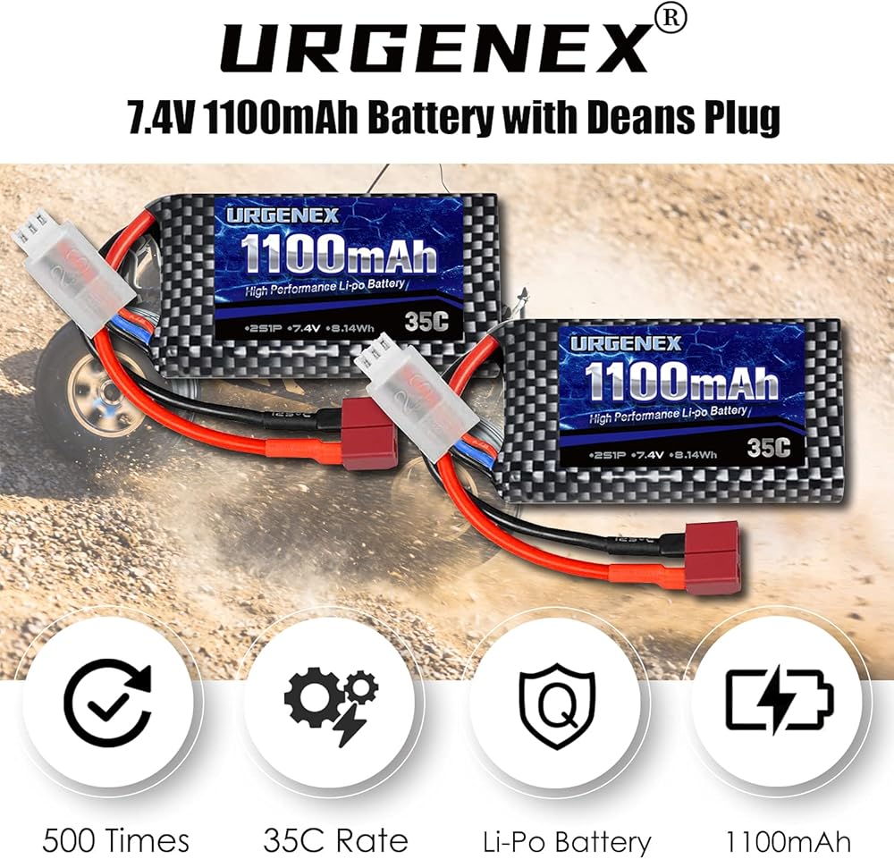 بطارية ليبو URGENEX 7.4 فولت 1100 مللي أمبير في الساعة RC مع قابس Deans T 35C معدل تفريغ عالي 2S بطارية ليبو متوافقة مع HBX، BEZGAR ومعظم 1/10، 1/12، 1/16، 1/18 مقياس RC شاحنة سيارة مع شاحن 1TO2