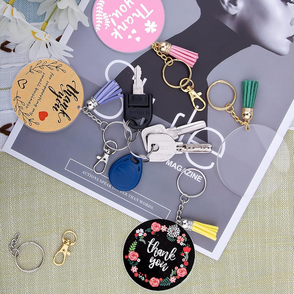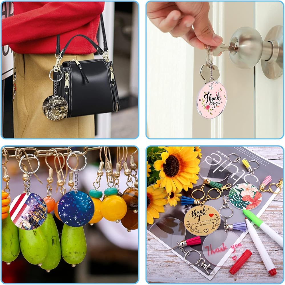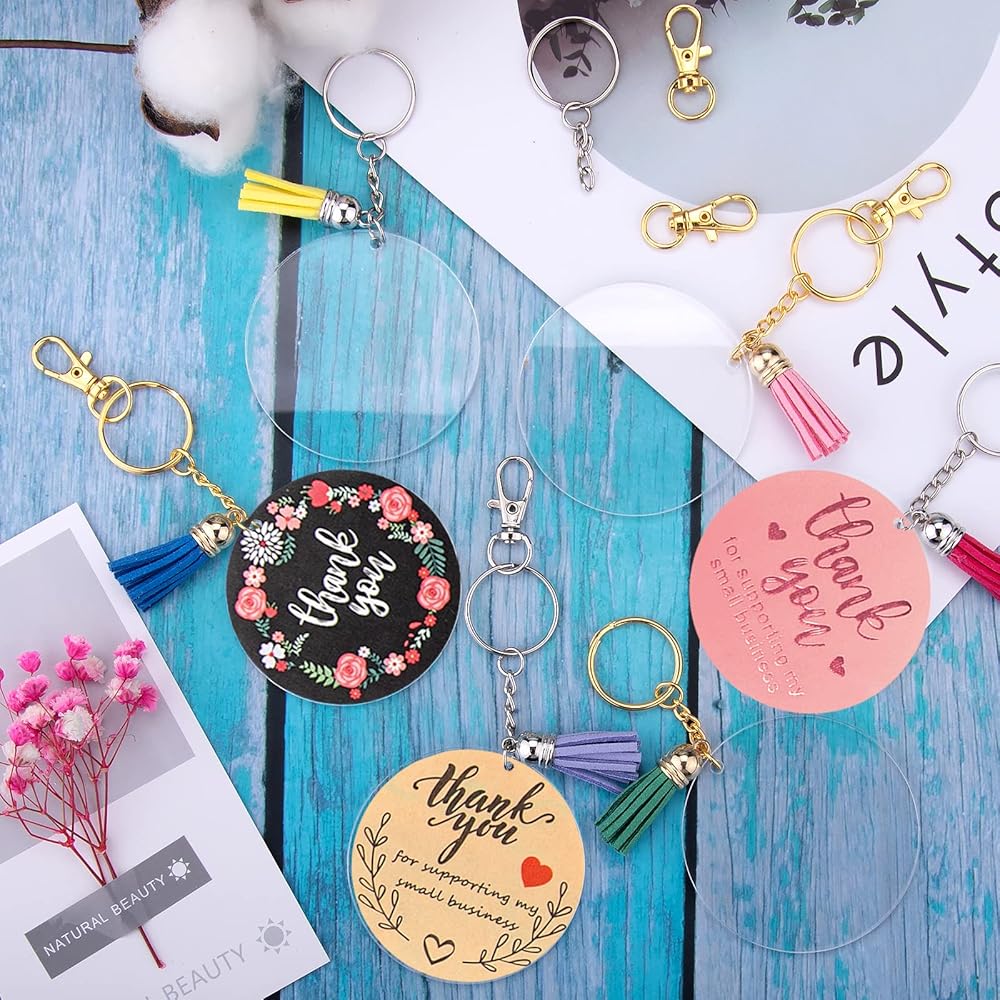 فراغات سلسلة مفاتيح أكريليك عملية: يمكنك رسم أو نحت أو لصق الملصق المفضل لديك على سلسلة المفاتيح المستديرة الفارغة المصنوعة من الأكريليك الشفاف، وتزيين جولة الأكريليك الخاصة بك بحلقات المفاتيح وشرابات سلسلة المفاتيح الملونة، مما يجعل مشروع DIY الخاص بك أكثر تميزًا وإبداعًا