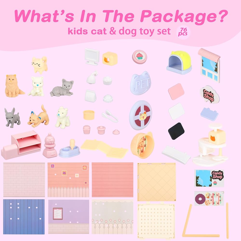 ألعاب القطط من TQQFUN للأطفال، مجموعة لعب تظاهرية مكونة من 76 قطعة للقطط والكلاب، هدية للأطفال الصغار للعب الأدوار التفاعلية مع حلوى الكعك، لعبة تعليمية لبيت الدمى للحيوانات الأليفة للفتيات والأولاد من سن 3 4 5 6+