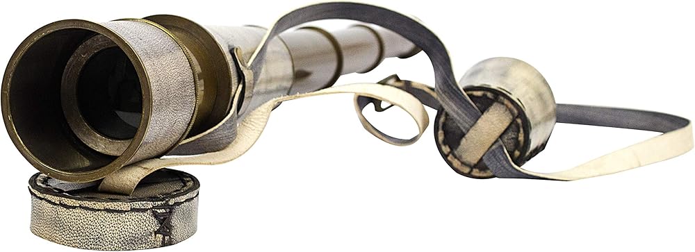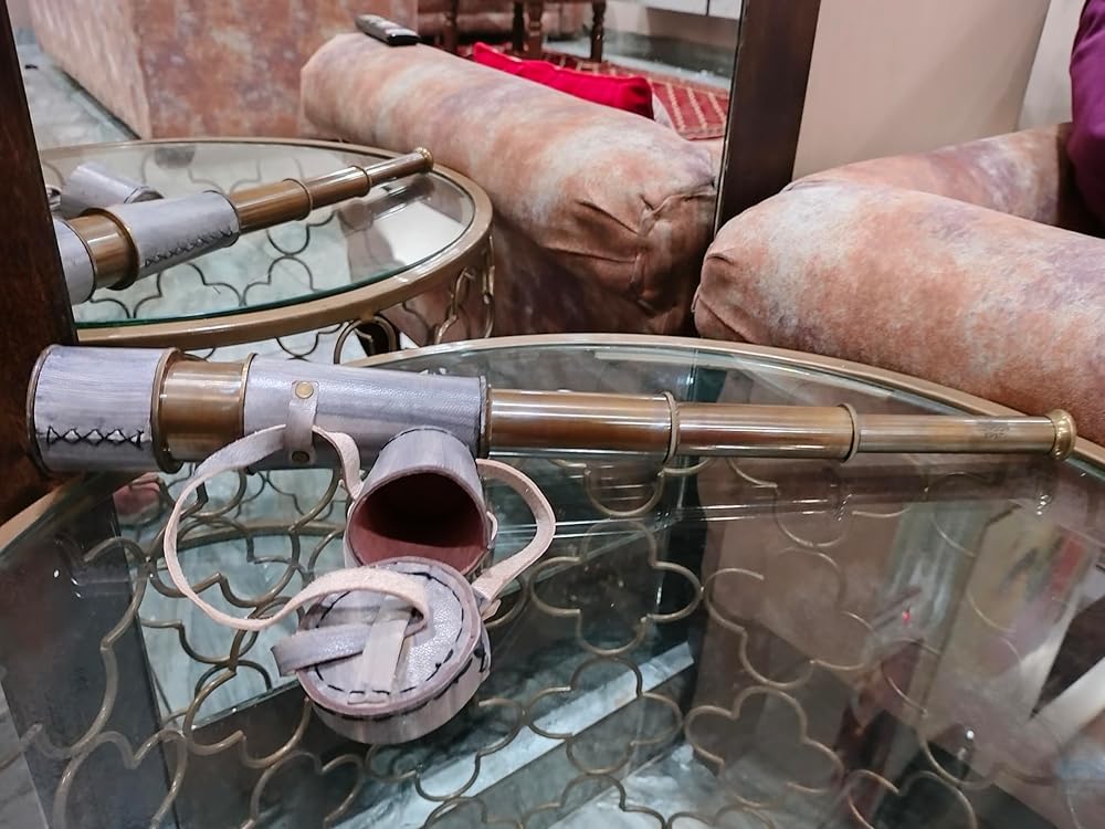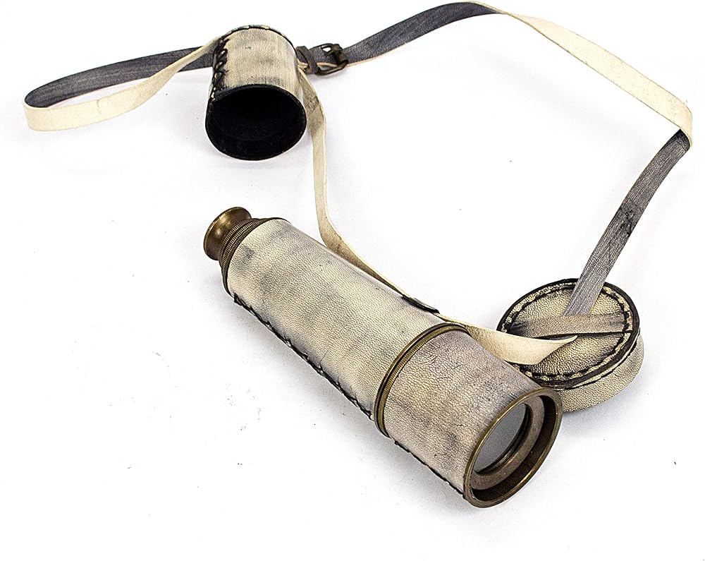 This telescope made up of brass & leather, comes in antique finish grey leather wrapped. It's eye piece needs to be adjusted by moving inside and outside to reach a Focus, Once Focused it will show the objects clearly.