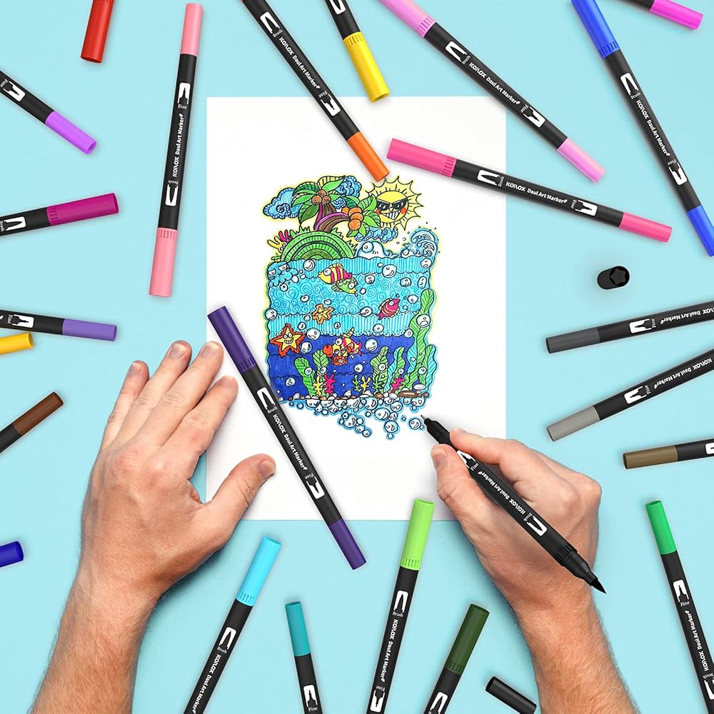 قلم فرشاة مزدوج الرأس من كويلوكس، مجموعة أقلام ألوان مائية، قلم رسم مزدوج الأطراف 24 لونًا، قلم تحديد الخطوط الدقيقة، قلم تحديد ذو أساس مائي، يستخدم للخطوط العريضة والرسم والخط وكتب التلوين. (24)