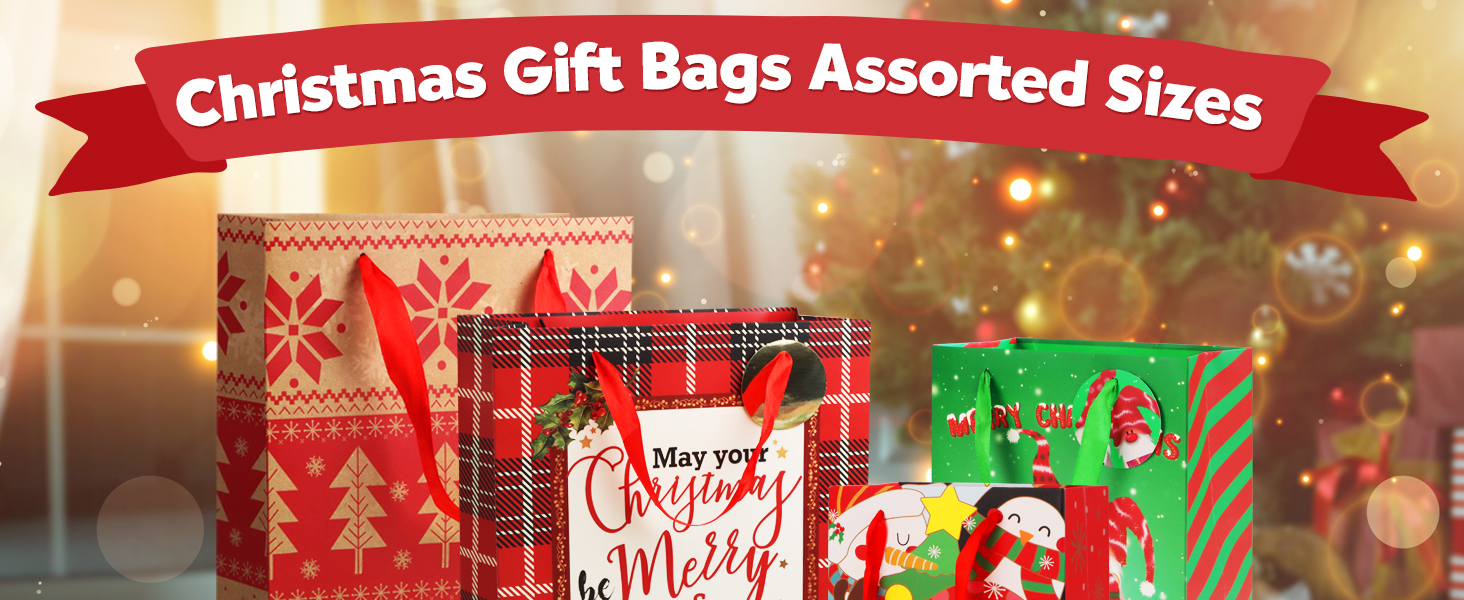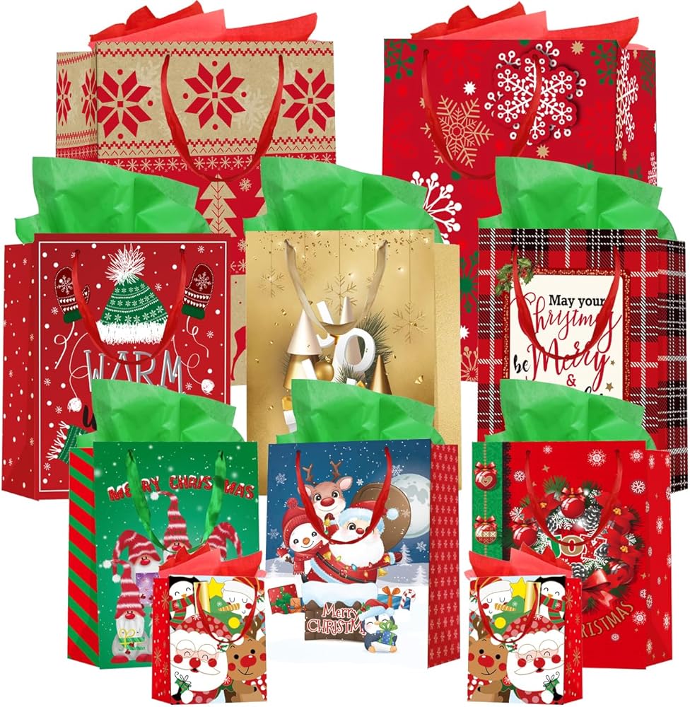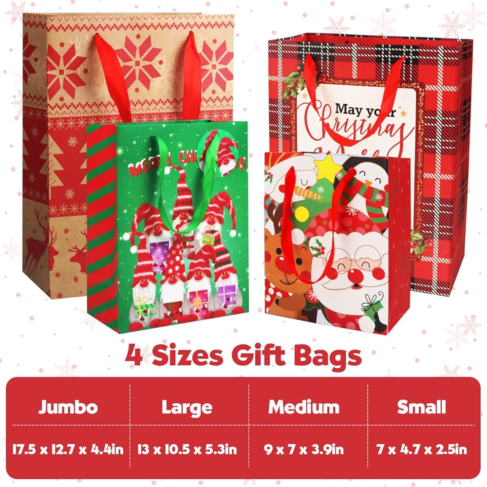 24 حزمة من أكياس هدايا عيد الميلاد بأحجام متنوعة: حقائب عيد الميلاد مع مناديل ورقية، أكياس هدايا كبيرة الحجم، أكياس تغليف هدايا قابلة لإعادة الاستخدام لحفلات أعياد الميلاد وحقائب هدايا العطلات، كبيرة الحجم ومتوسطة وصغيرة