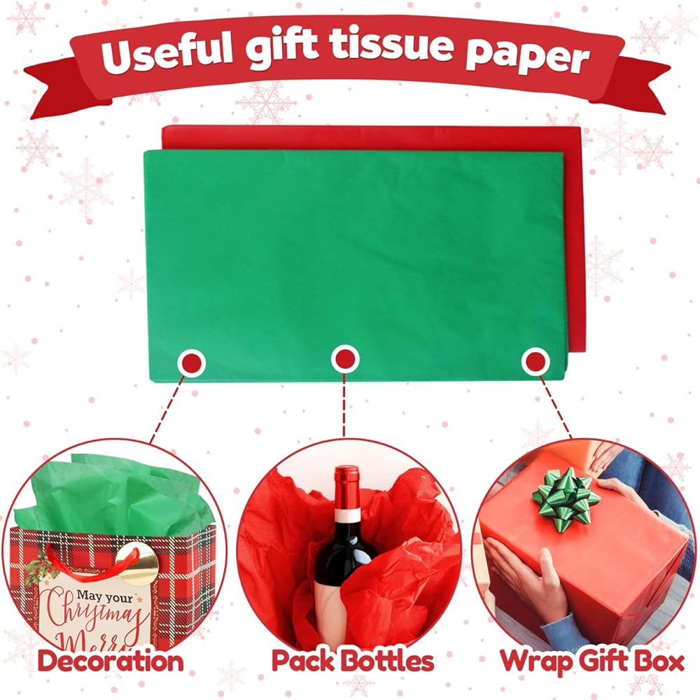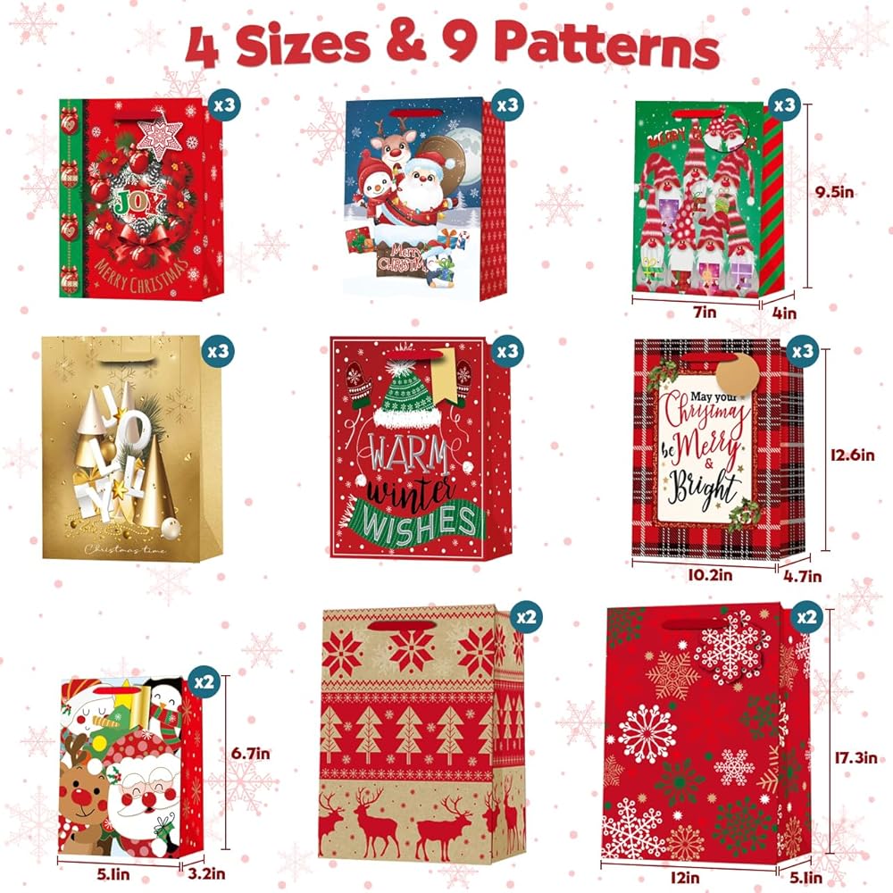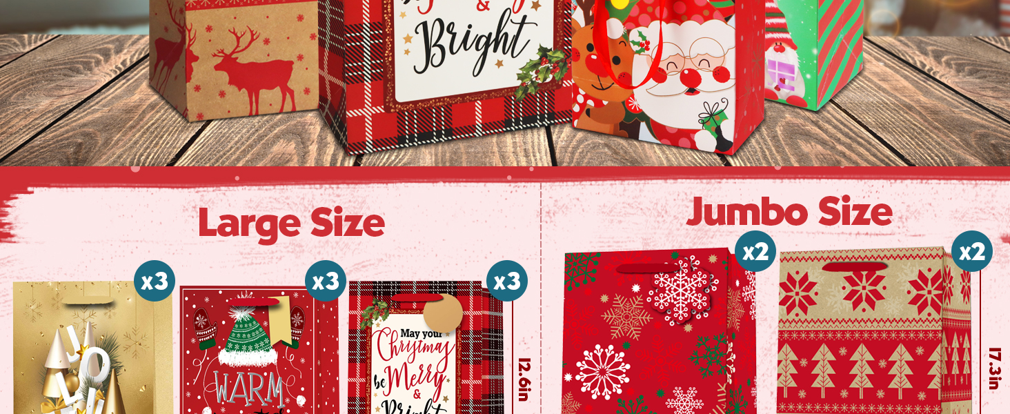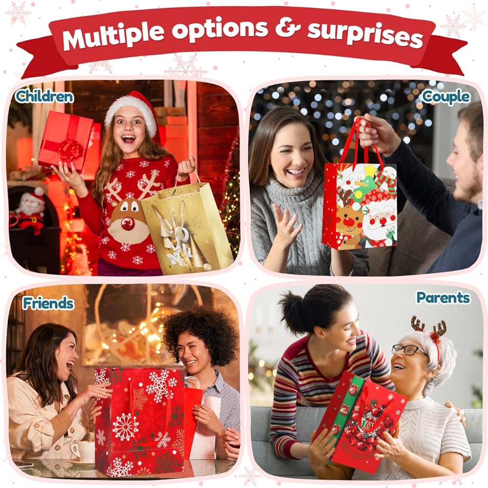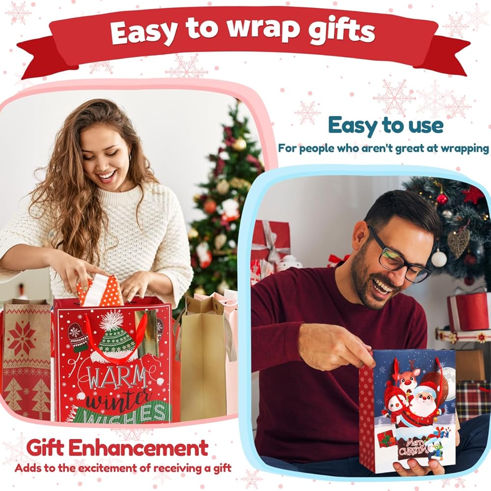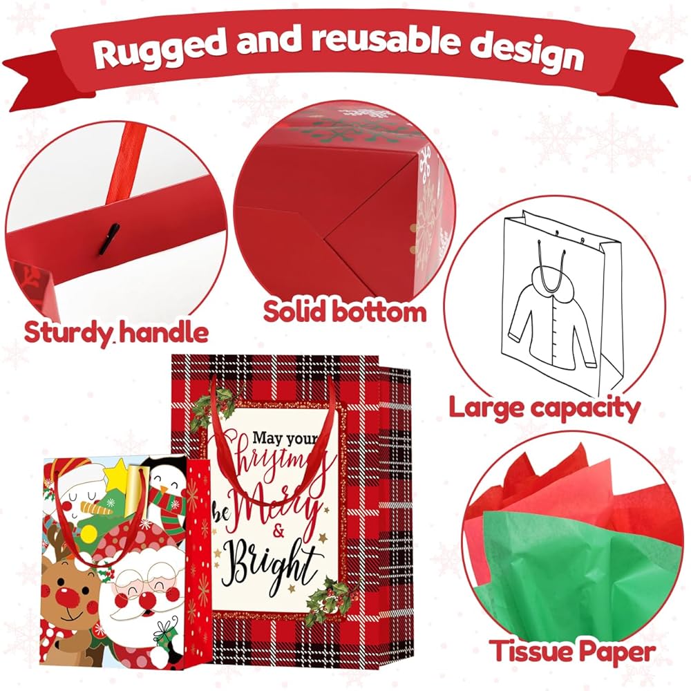 حقائب هدايا عيد الميلاد المتينة: حقائب الهدايا لدينا مصنوعة من ورق عالي الجودة ومواد متينة أخرى لضمان قدرتها على تحمل وزن الهدايا، وحمايتها في حالتها الأصلية. إنها ليست صديقة للبيئة فحسب، بل قابلة لإعادة الاستخدام أيضًا. تتميز حقائب الهدايا ذات المقابض بمقابض قوية معززة، مما يجعل من السهل عليك حمل الهدايا.