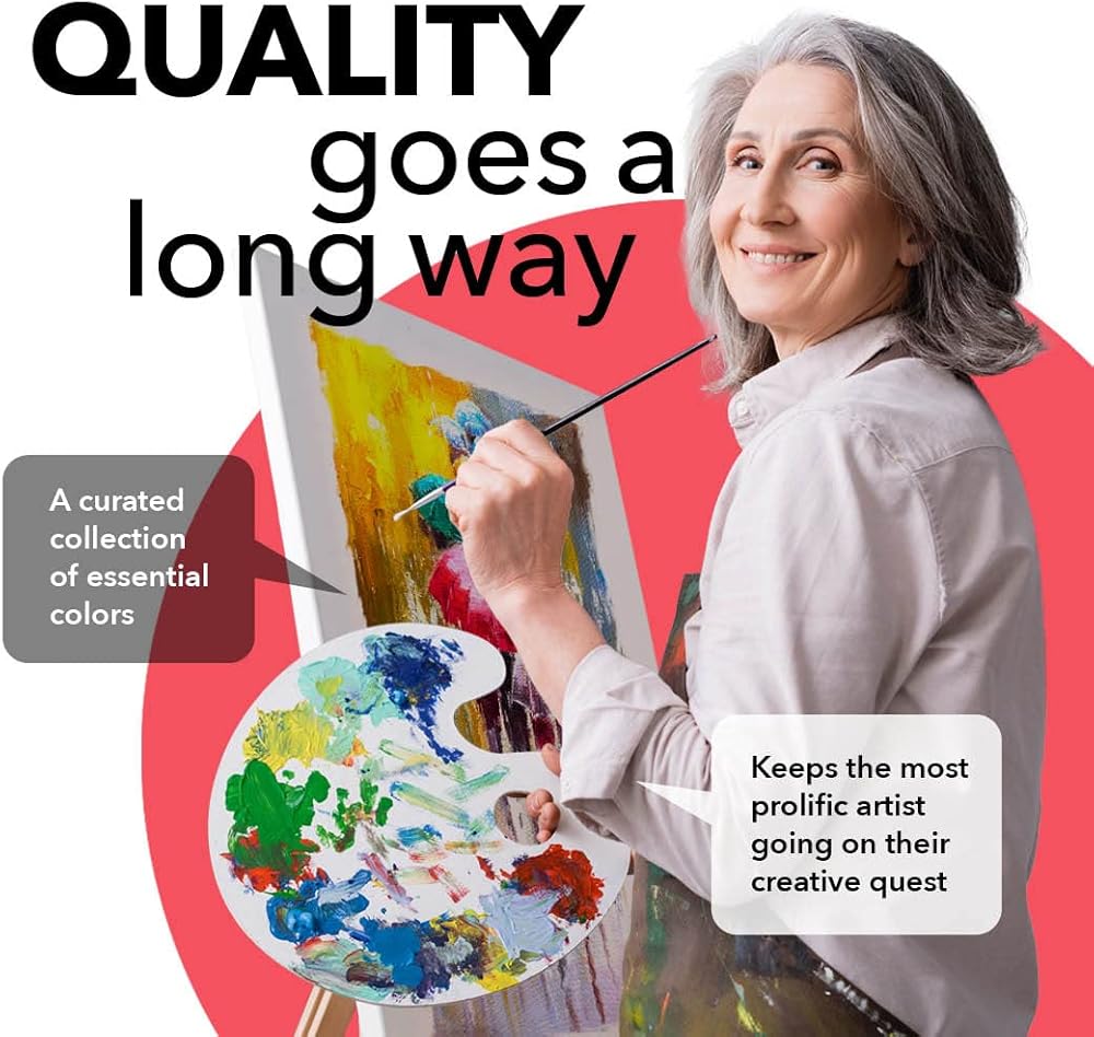 • متعة الاستخدام استمتع بإحساس وضع أصباغ غنية ونقية باستخدام الفرشاة أو سكين اللوحة؛ تجفيف سريع حتى تتمكن من بناء الطبقات بسرعة دون التعكير وتحقيق نتائج لافتة للنظر على الورق أو القماش أو الخشب.