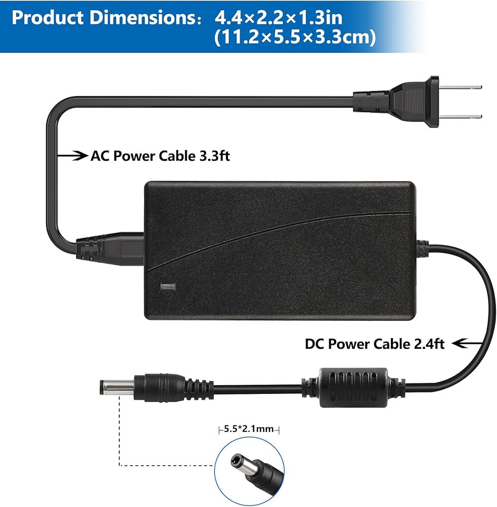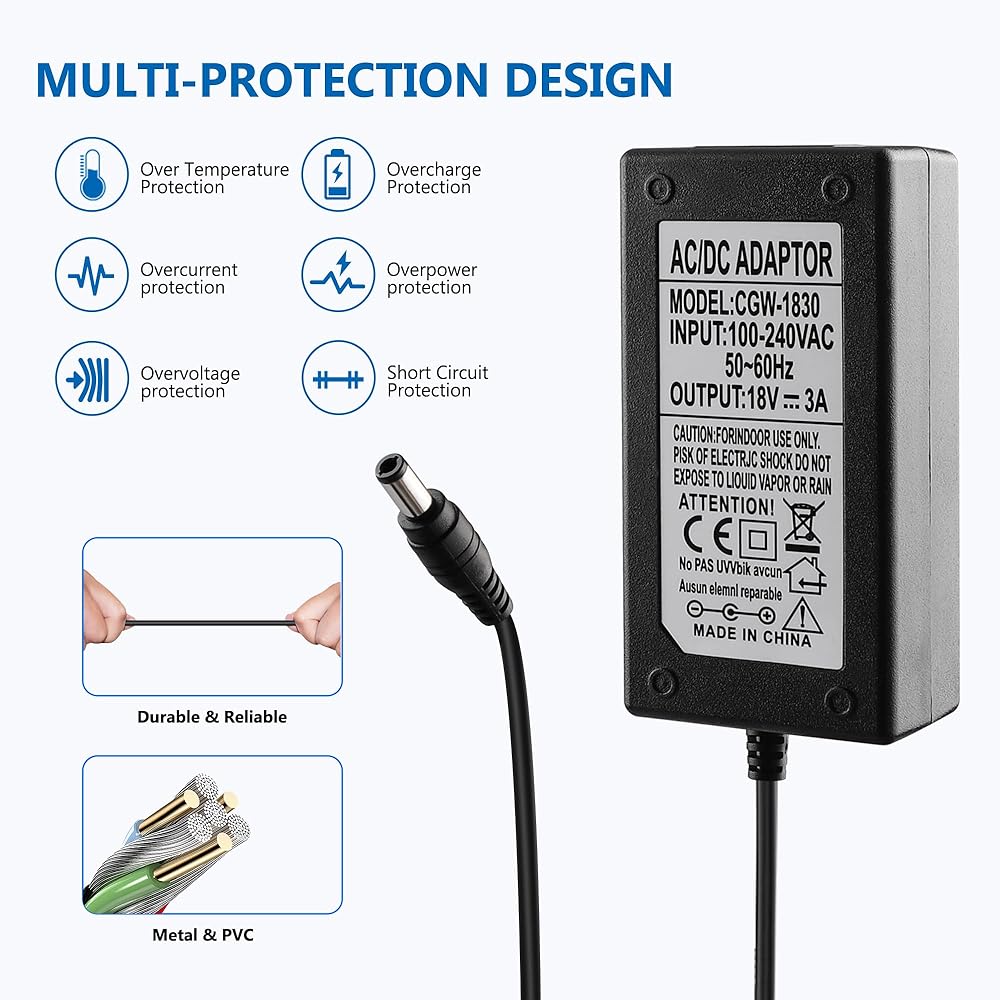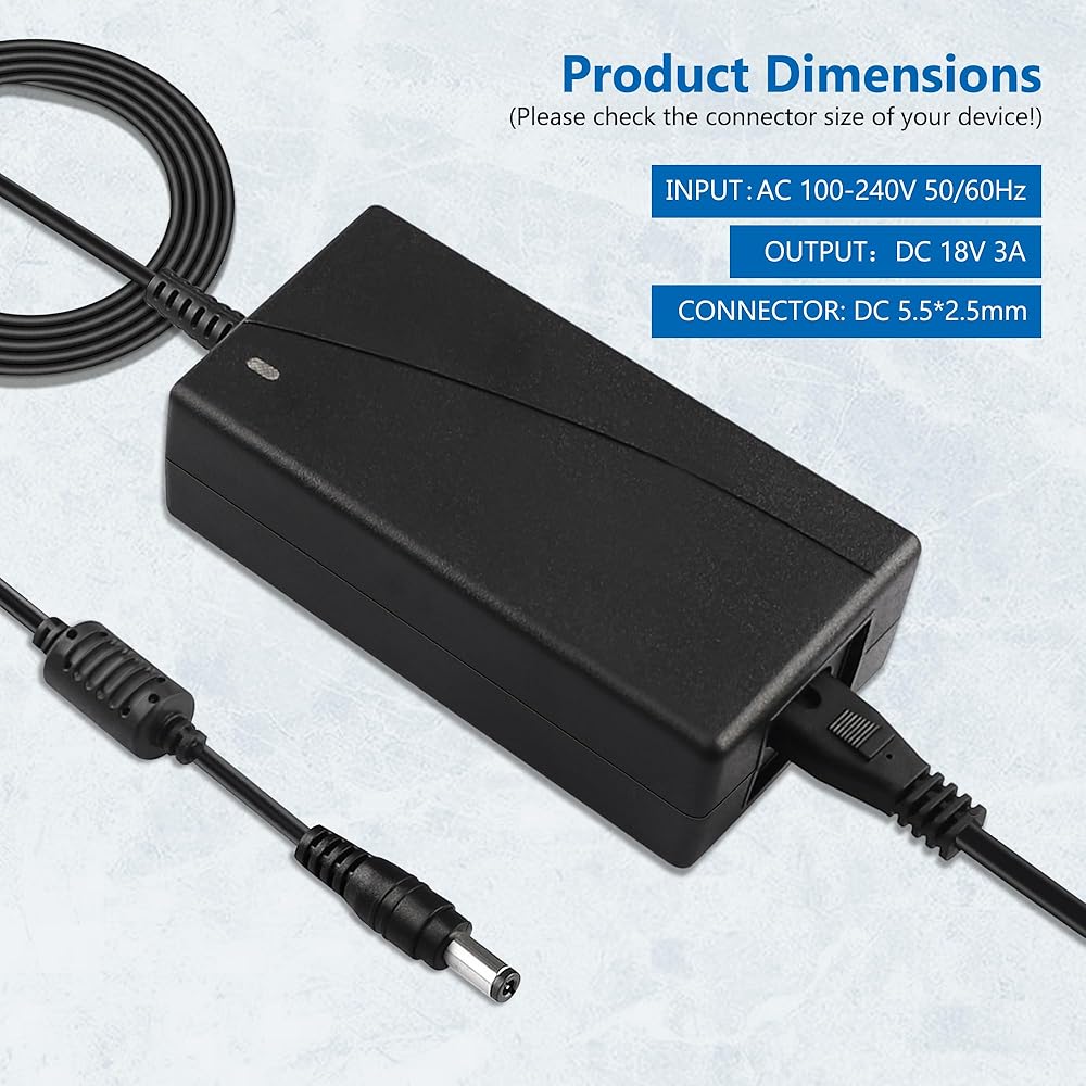 ★【مواصفات الطاقة 】: الإدخال: التيار المتناوب 100-240 فولت 50/60 هرتز ؛ الإخراج: DC18V 3A (متوافق مع 1A/1.5A/2A/2.5A)؛ الموصل: تيار مستمر 5.5*2.5 مللي متر (يرجى التحقق من حجم الموصل بجهازك!). طول الكابل: 6.6 قدم