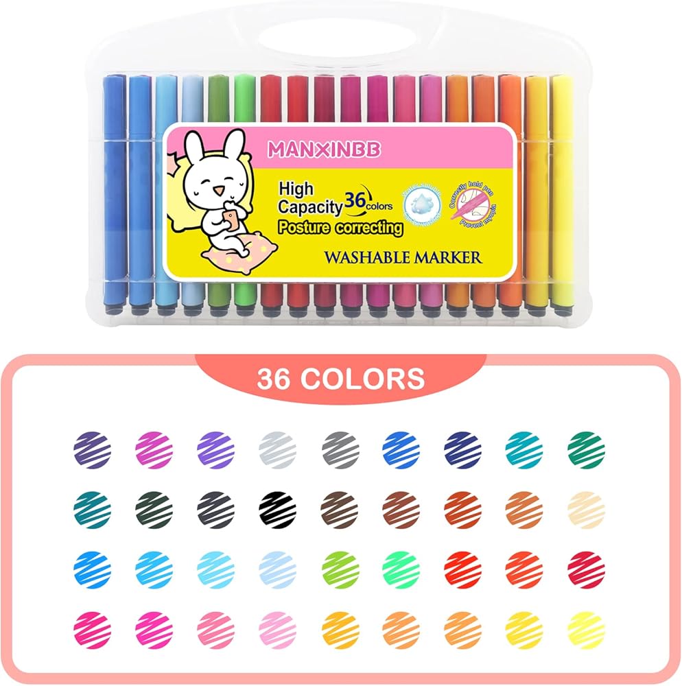 مجموعة أقلام ماركر: تتضمن 36 قلم ماركر قابل للغسل في حقيبة سفر متينة.