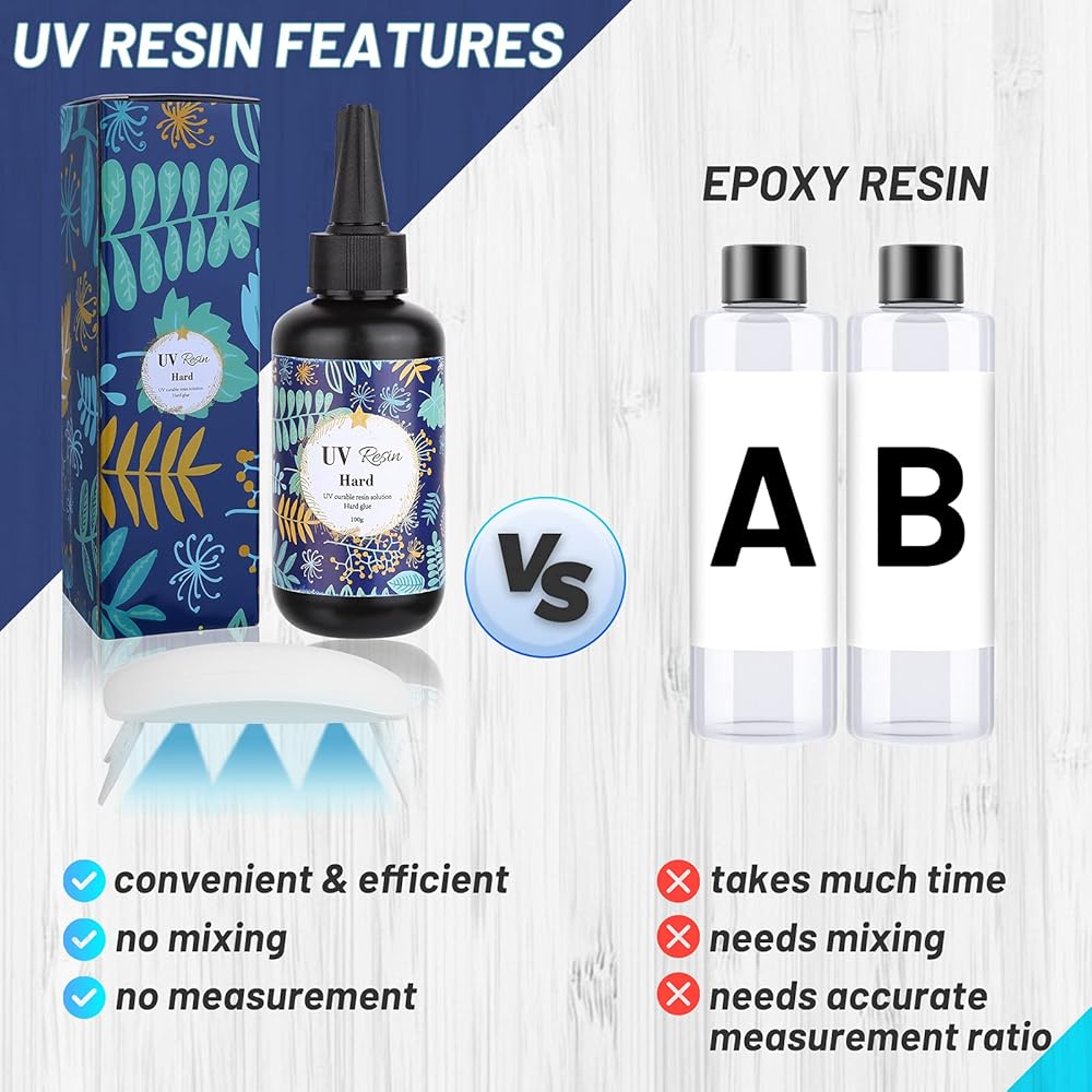 تشتمل مجموعة راتينج الأشعة فوق البنفسجية هذه على جميع مواد راتينج المجوهرات واللوازم ومصباح راتينج الأشعة فوق البنفسجية لعملية معالجة سريعة وراتنج إيبوكسي صلب شفاف للأشعة فوق البنفسجية لبدء أعمالك الفنية وصنع عناصر الديكور لمنزلك ومكتبك، كما أنها مثالية لأصدقائك.