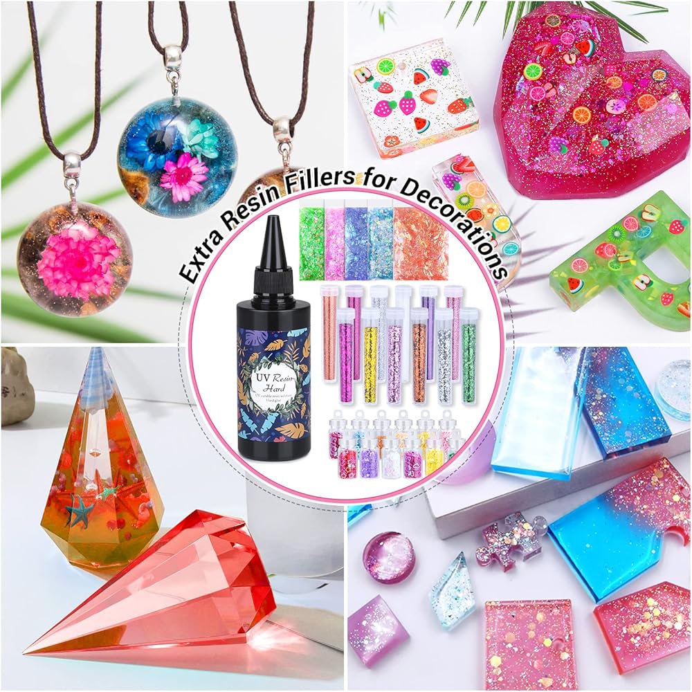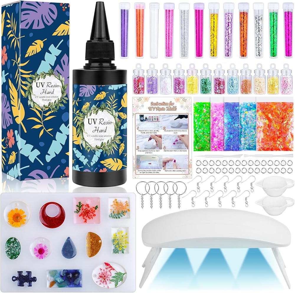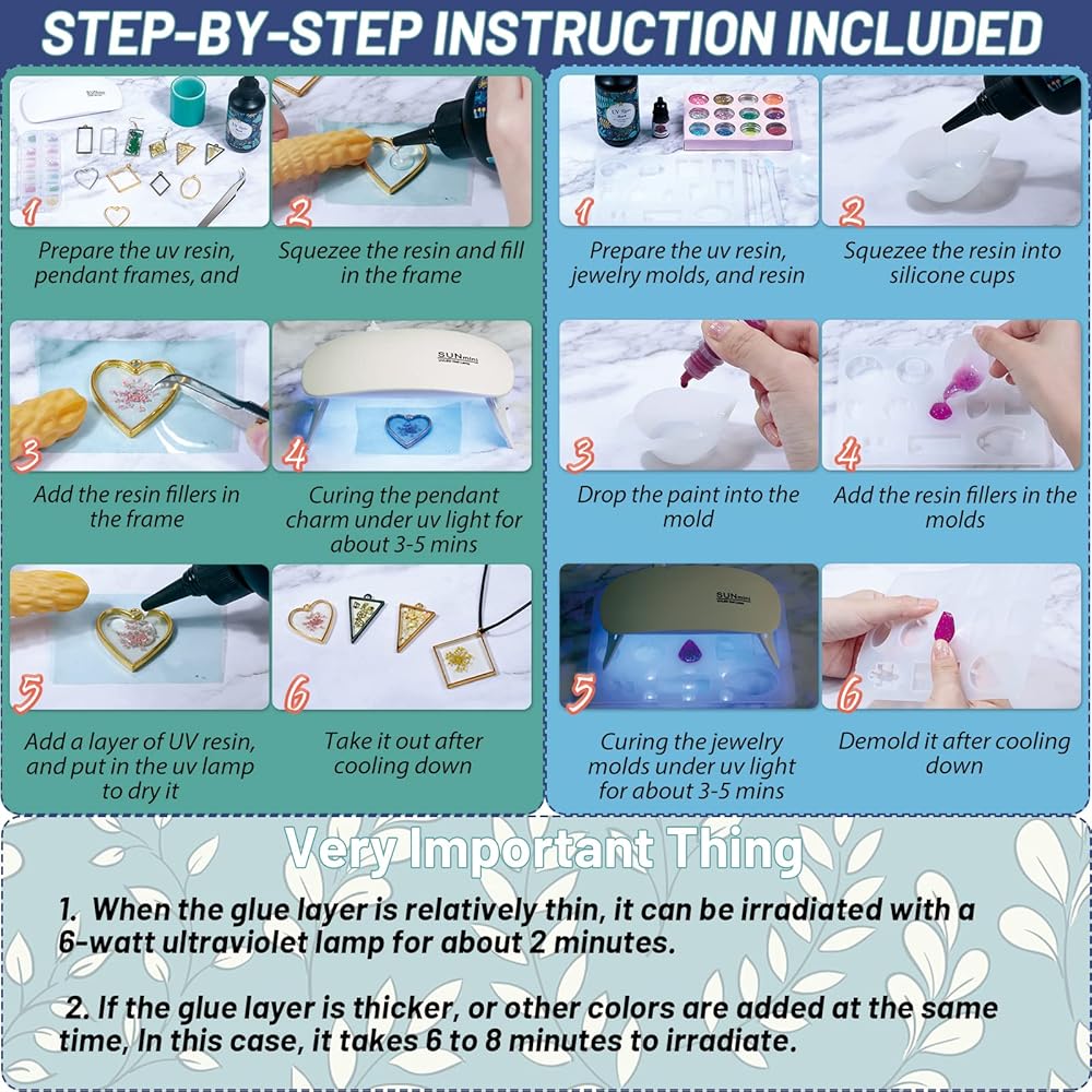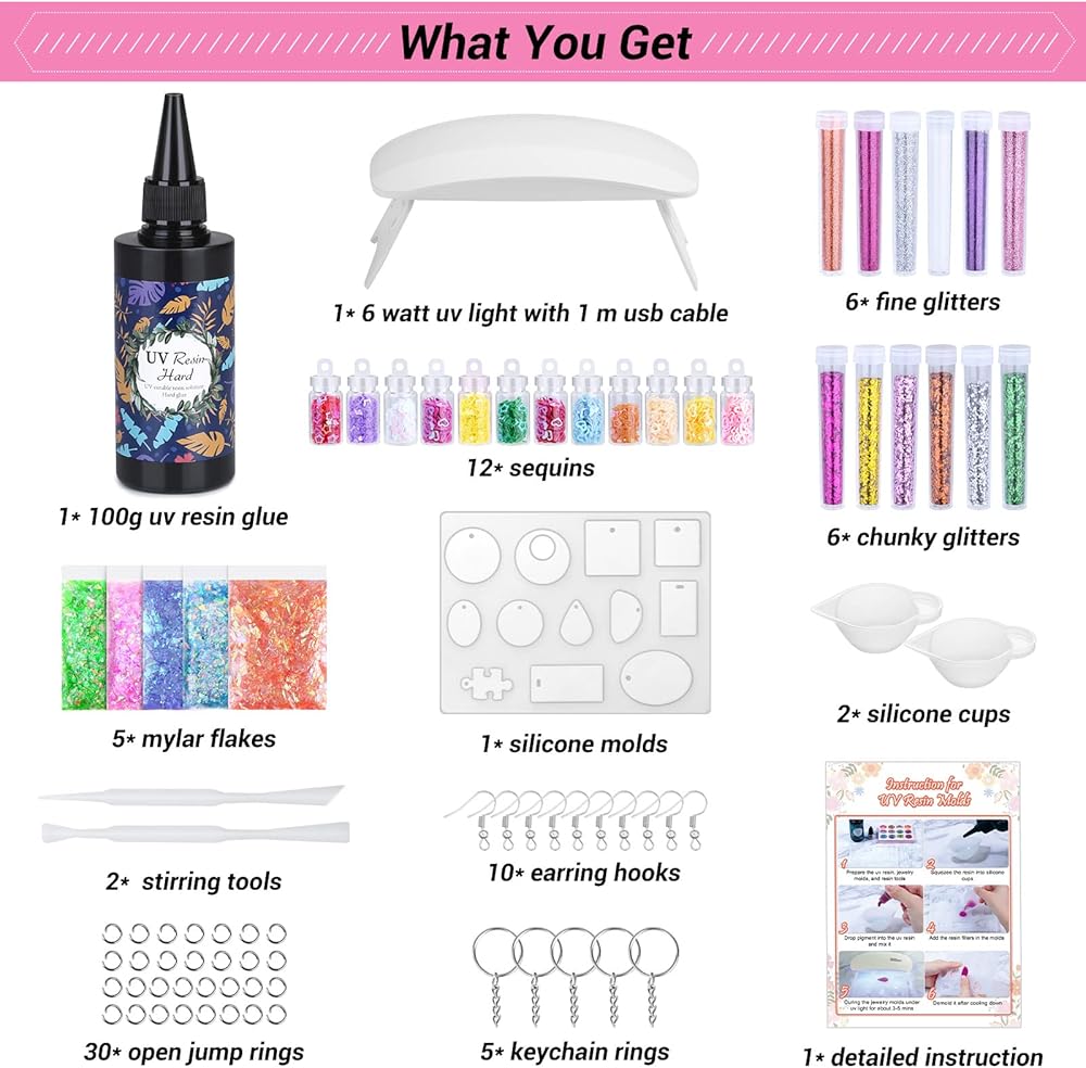 ✅مجموعة راتنج رائعة للمبتدئين ✅تأتي مجموعة راتينج Cruzix UV مع ضوء الأشعة فوق البنفسجية، وراتنج الأشعة فوق البنفسجية 100 جرام، وقوالب السيليكون، وتعليمات عملية خطوة بخطوة، وصبغة الراتنج، والترتر الملون، ورقائق المايلار، وشرائح البوليمر، والزهور المضغوطة المجففة كحشو للمجوهرات من الراتنج. ، سحر الإطارات، سلاسل القلائد، حلقات سلسلة المفاتيح، خطافات الأقراط، حلقات القفز، شريط بدون بقايا، ملاقط، مهود الأصابع، أدوات تقليب السيليكون، أكواب خلط السيليكون لأدوات الراتنج. مجموعة صنع المجوهرات الكل في واحد تجعلك تستمتع بمتعة الأعمال اليدوية!