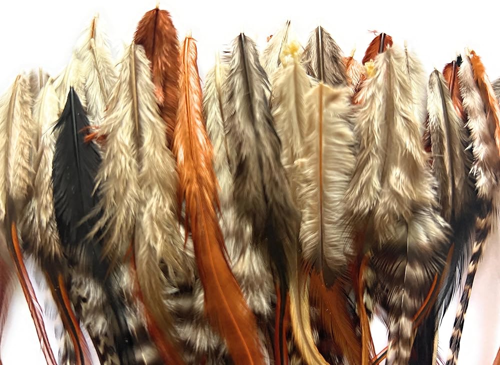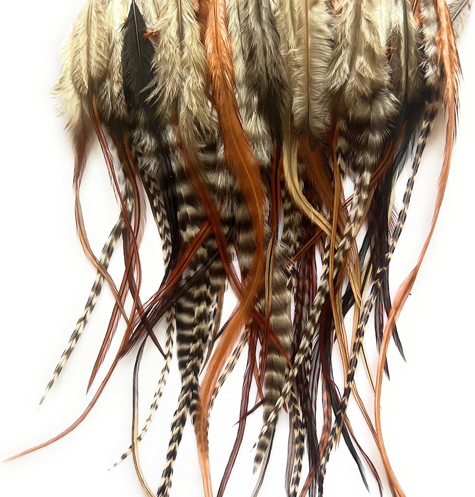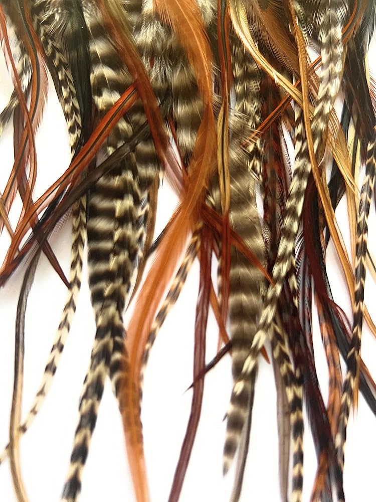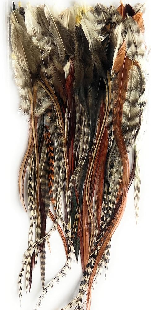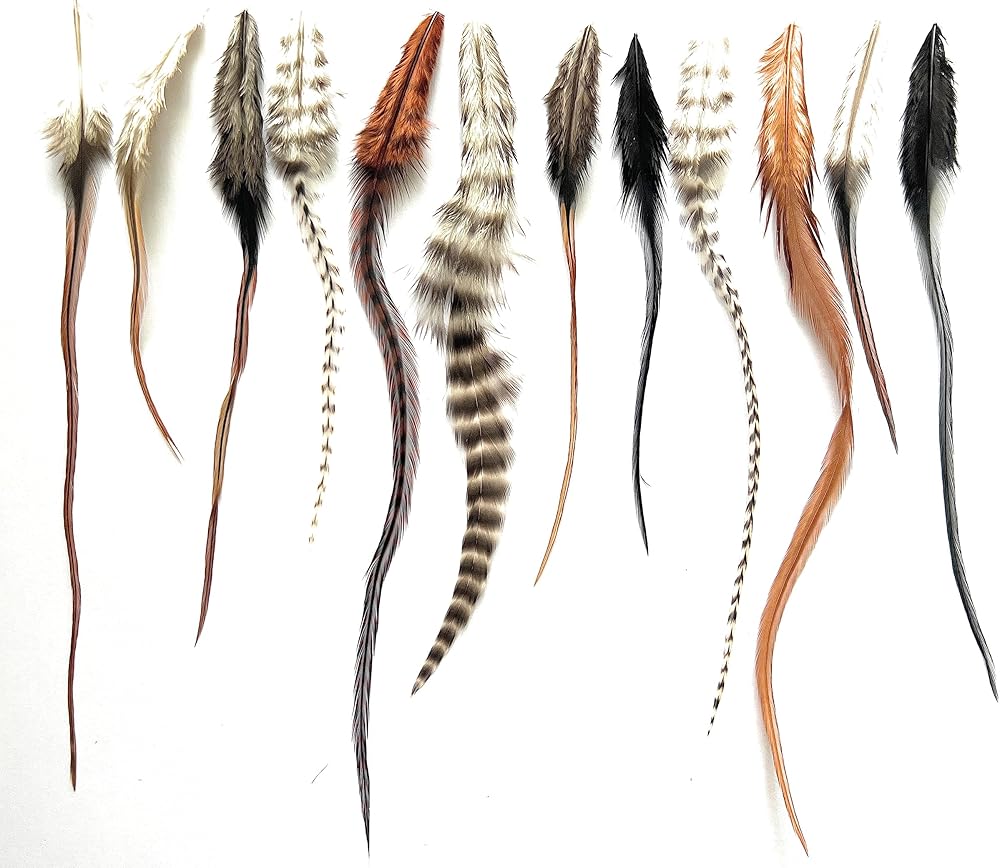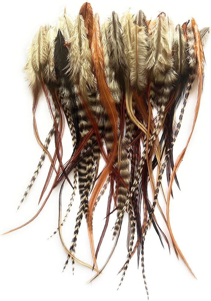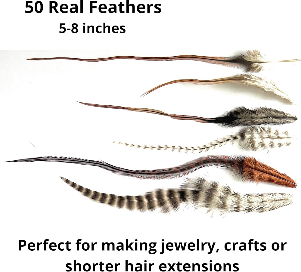 ريش ديك حقيقي قصير، أشيب مخطط، 50 وصلة شعر ريش أو حرف يدوية، 5-8 بوصات بني، أسود أبيض مخطط أشيب زغب طبيعي