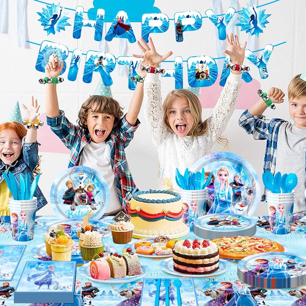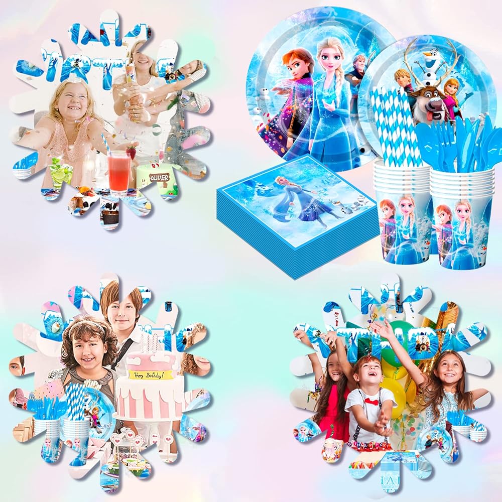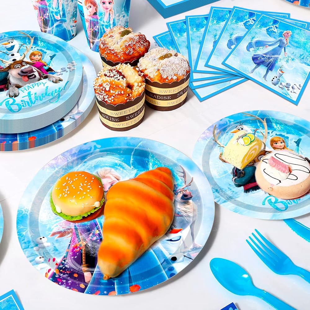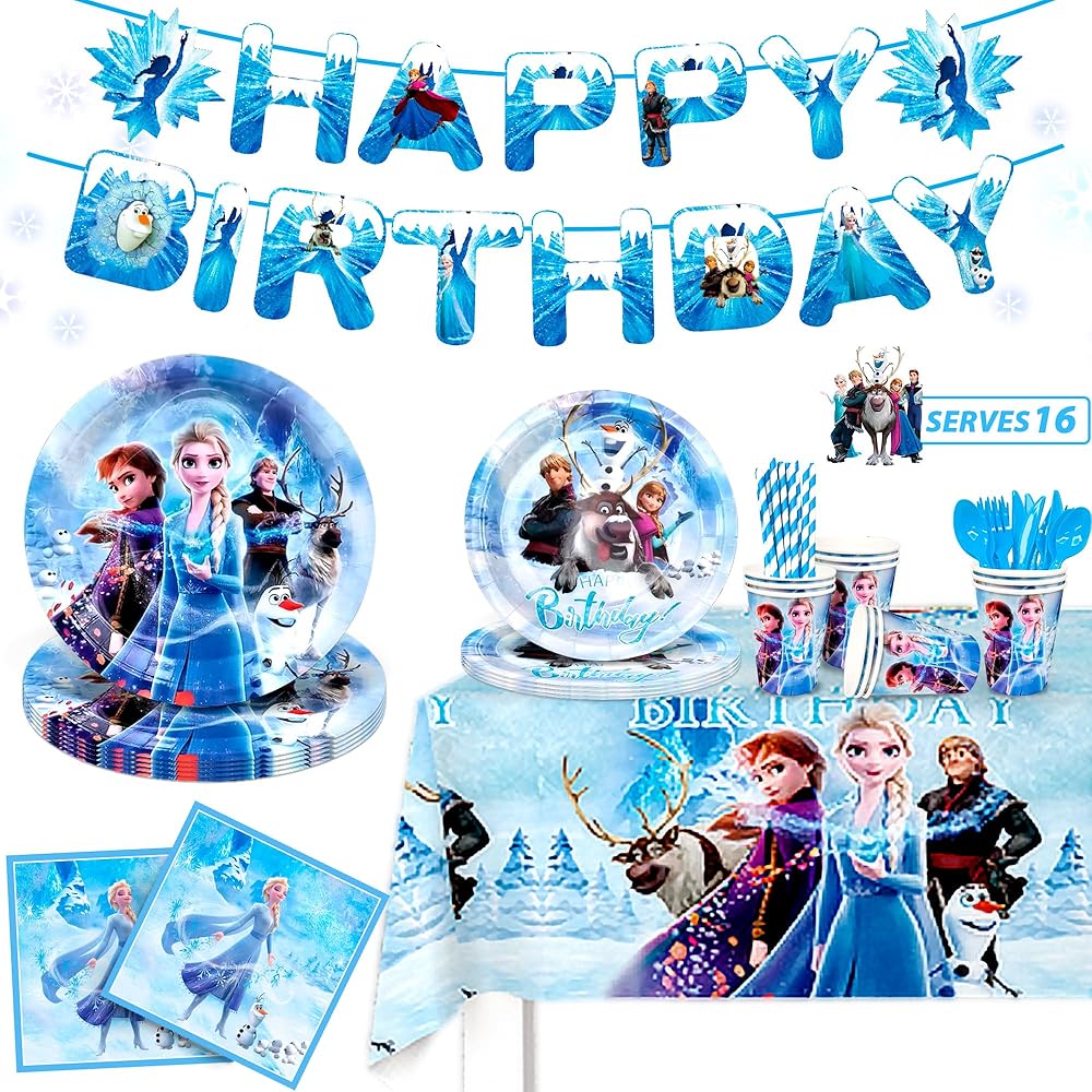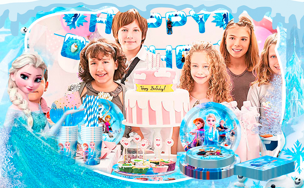 • 😃High Quality Material😃 The fro-zenn birthday plates and cups are all made of high quality paper,sturdy enough to hold any food or drink in the fro-zenn birthday party easily without leaking.
