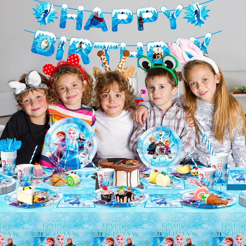 • ❄️Elsa Birthday Party Supplies Set❄️ Our fro-zenn party supplies set includes 1 fro-zenn happy birthday banner,1 table cloth fro-zenn,10 7'' elsa plates for birthday party,10 9'' fro-zenn themed birthday party plates,10 fro-zenn napkins,10 elsa party cups etc elsa party supplies.