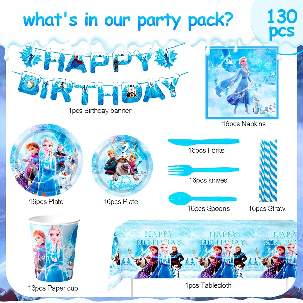 لوازم الحفلات فروزن، 130 قطعة من أدوات مائدة الحفلات المجمدة - أطباق فروزن ومناديل وأغطية طاولة ولافتة عيد ميلاد فروزن وما إلى ذلك لوازم حفلات أعياد الميلاد فروزن للفتيات