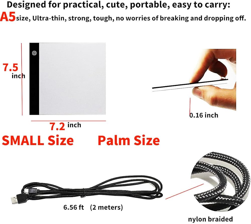 صندوق اضاءة LED صغير محمول ورفيع للغاية مقاس A5، لوحة تتبع قابلة للتعتيم وسطوع قابل للتعديل للفنانين والرسم والتتبع والرسوم المتحركة والحرف الفنية والرسم الماسي خماسي الابعاد