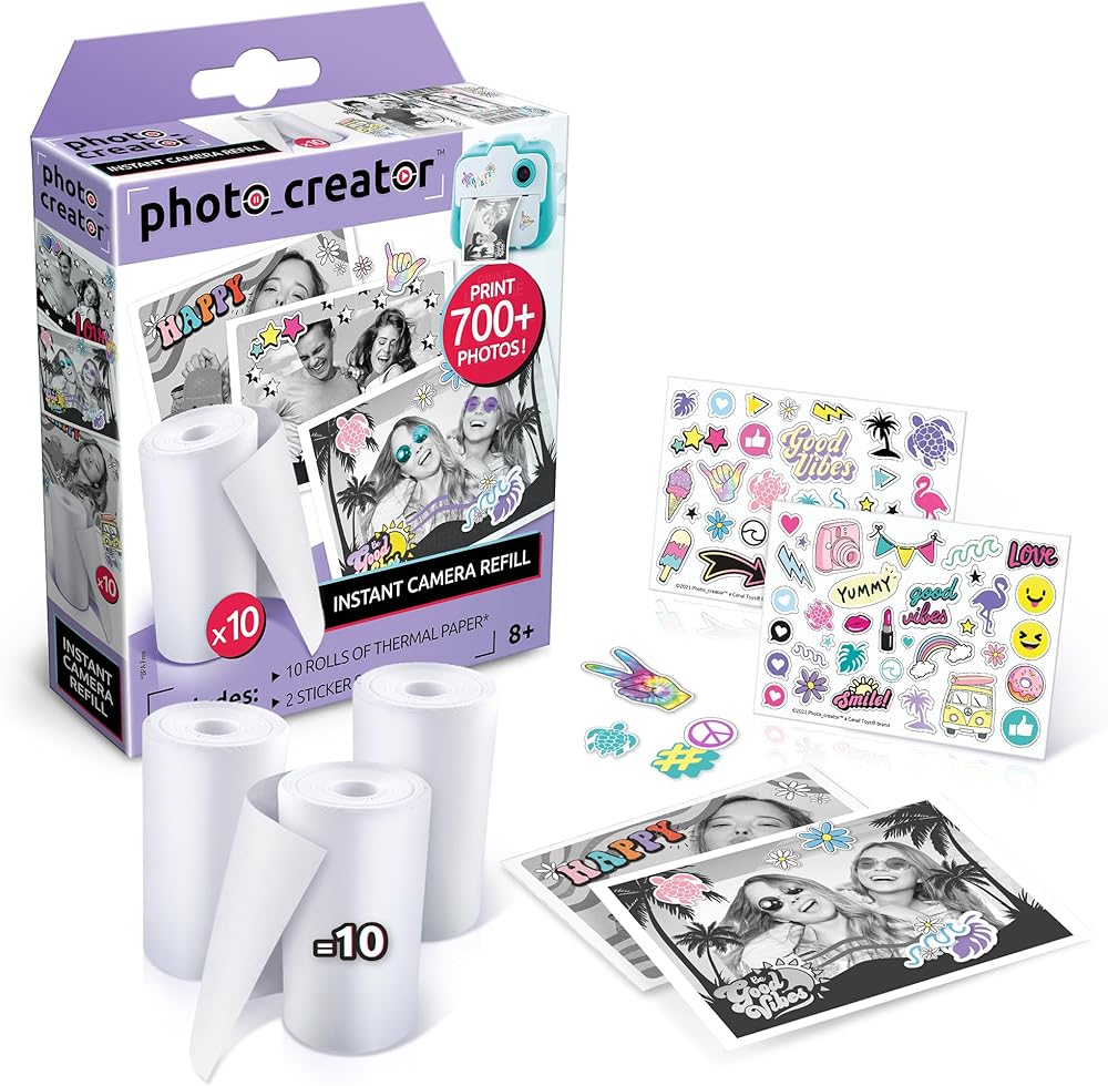 تشتمل مجموعة إعادة التعبئة هذه على 10 لفات من الورق الحراري الأبيض وورقتين لاصقتين للاستخدام مع كاميرا الطباعة الفورية Photo Creator من Canal Toys. (الكاميرا غير متضمنة، تباع بشكل منفصل). يمكن لهذه اللفة القياسية طباعة ما يقرب من 70 صورة (5.6 × 700 سم). توفر هذه المجموعة الكاملة إمكانية طباعة أكثر من 700 صورة وهي سهلة الاستخدام للغاية، بدون حبر! تتم الطباعة عن طريق النقل الحراري ولا تتطلب أي وقت للتجفيف. يتم أيضًا تضمين ورقتين من الملصقات (7.5 × 10.5 سم لكل منهما) لتزيين صورك. للأعمار من 8 سنوات فما فوق