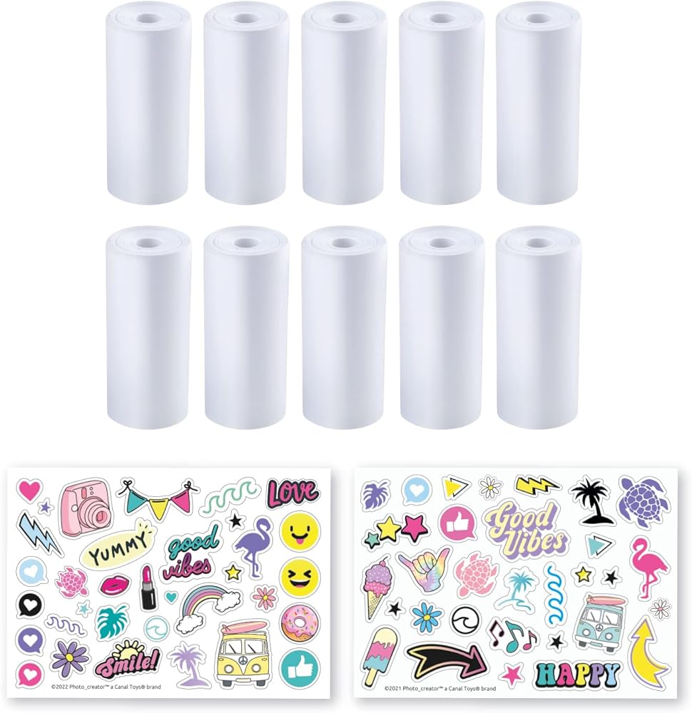 تشتمل مجموعة إعادة التعبئة هذه على 10 لفات من الورق الحراري الأبيض وورقتين لاصقتين للاستخدام مع كاميرا الطباعة الفورية Photo_Creator من Canal Toys. (الكاميرا غير متضمنة، تباع بشكل منفصل).
