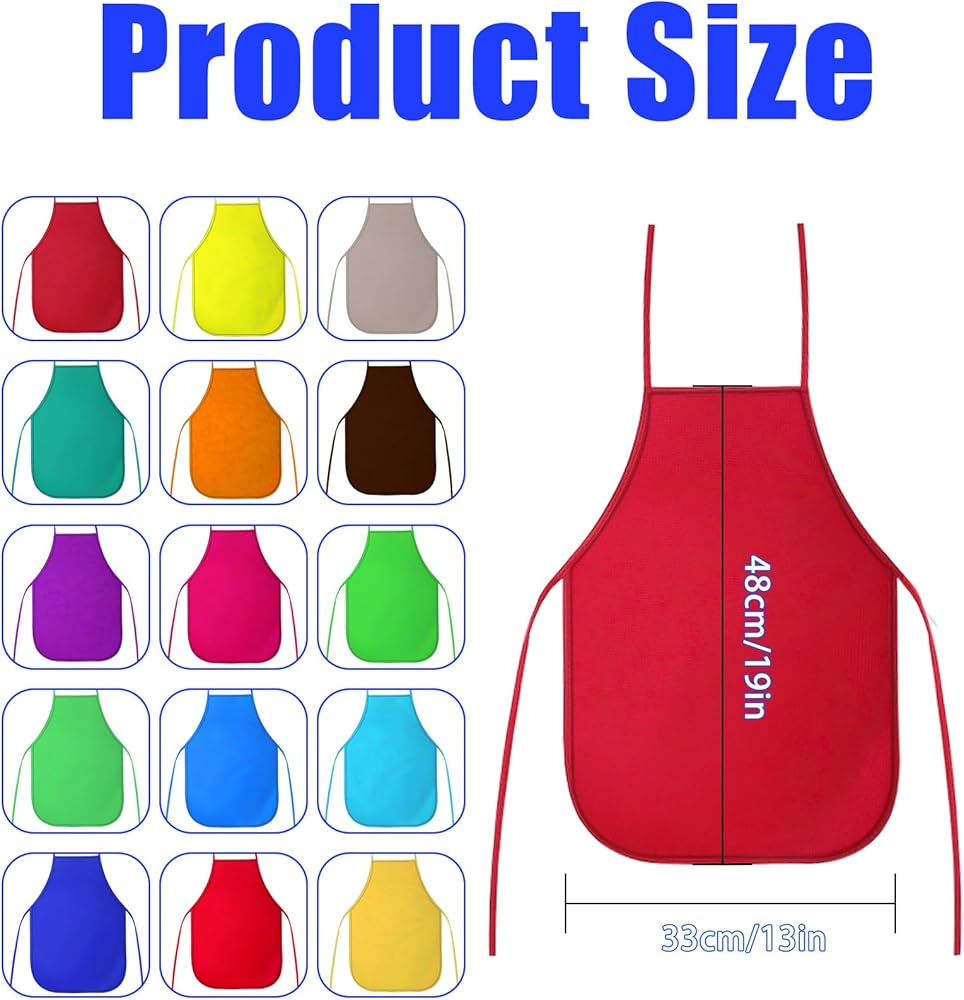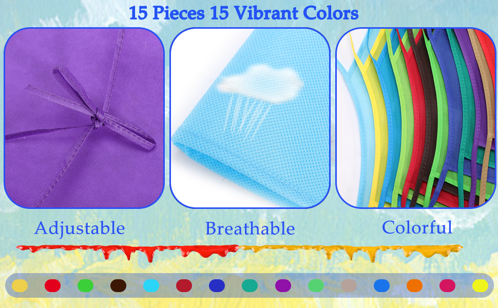 🌈【Package Content】15pcs 15 colors kids painting aprons 33x48cm/13x19in. Red, wine red, rose red, blue, sky blue, dark blue, green, dark green, light green, purple, coffee, gray, orange, yellow, light yellow, multiple colors to meet your various favors. Children's artists fabric aprons with open ties, you can adjust the tie according to your kid needs.