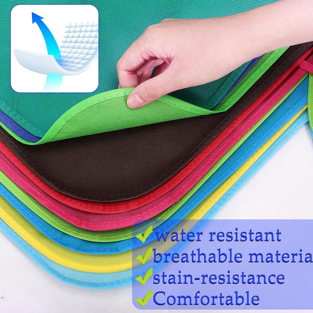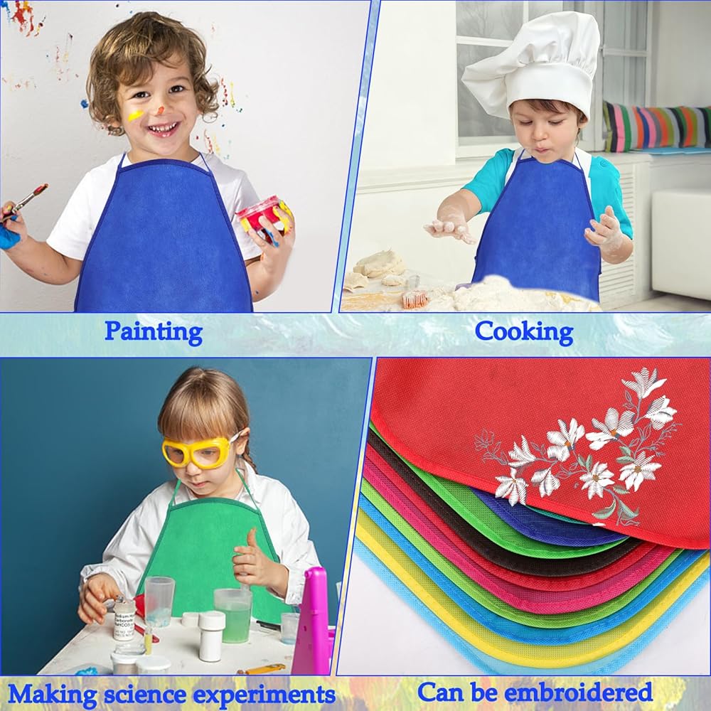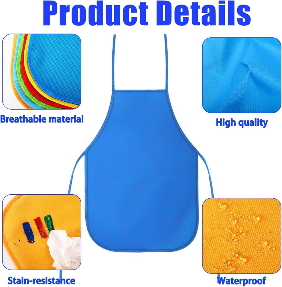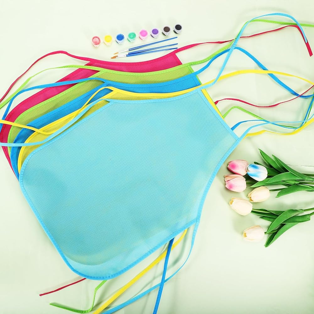 🌈【Professional Quality】Our kids art aprons made of non woven fabric, soft and skin friendly, waterproof and reliable, not easy to wrinkle. Very comfortable for kids to wear, easy to wash and clean with machine and water. Durable non-woven aprons can be used over and over, suitable for you to use for a long time.