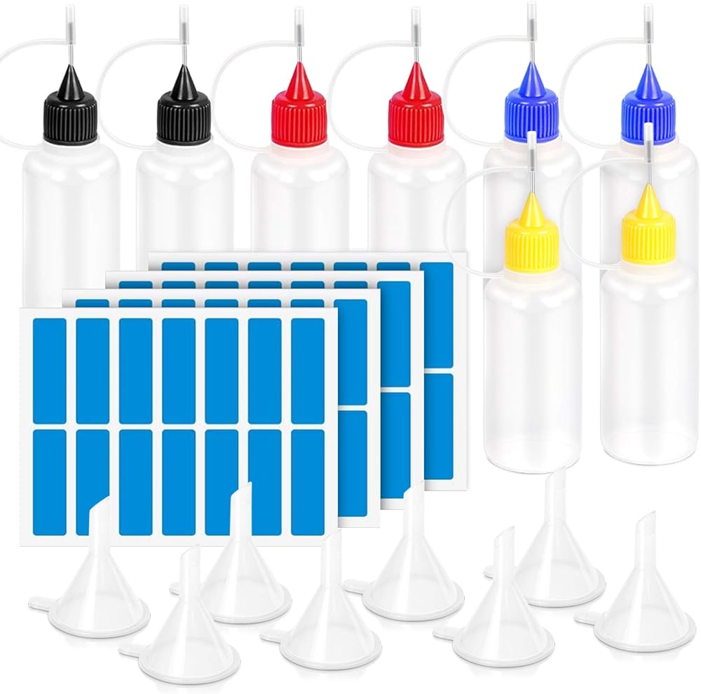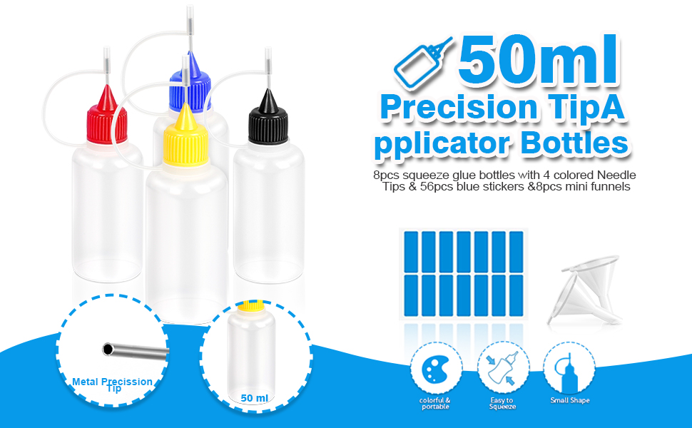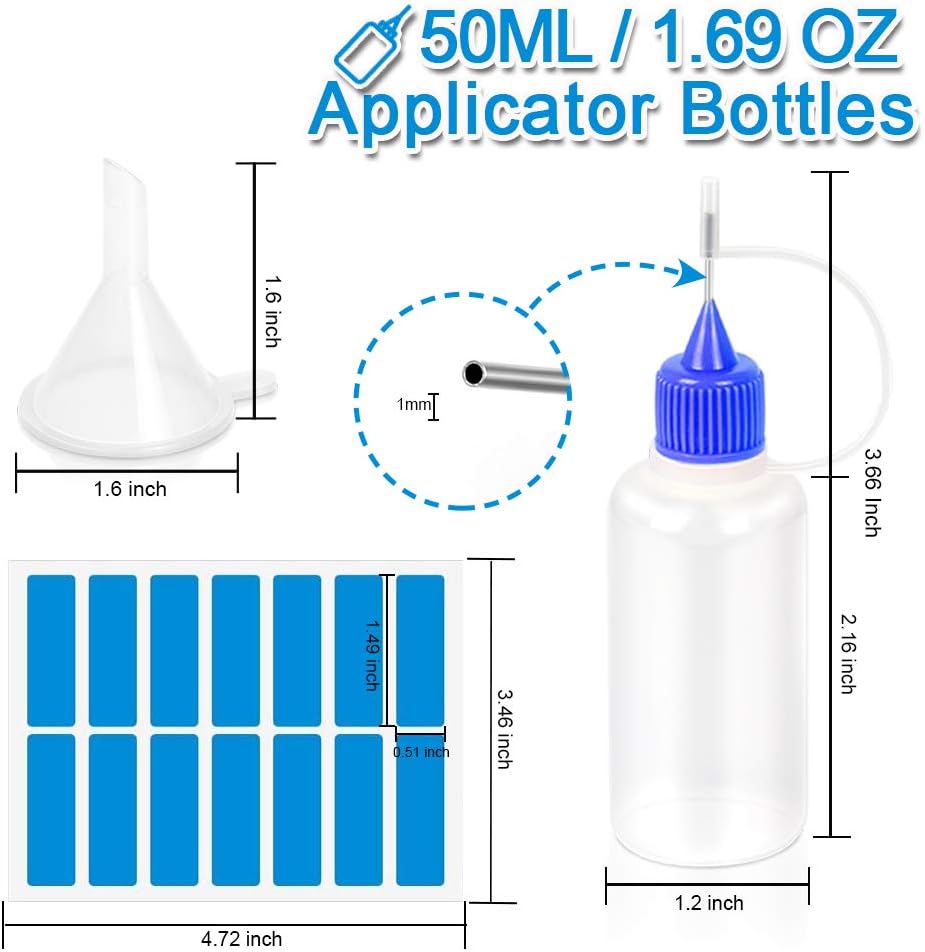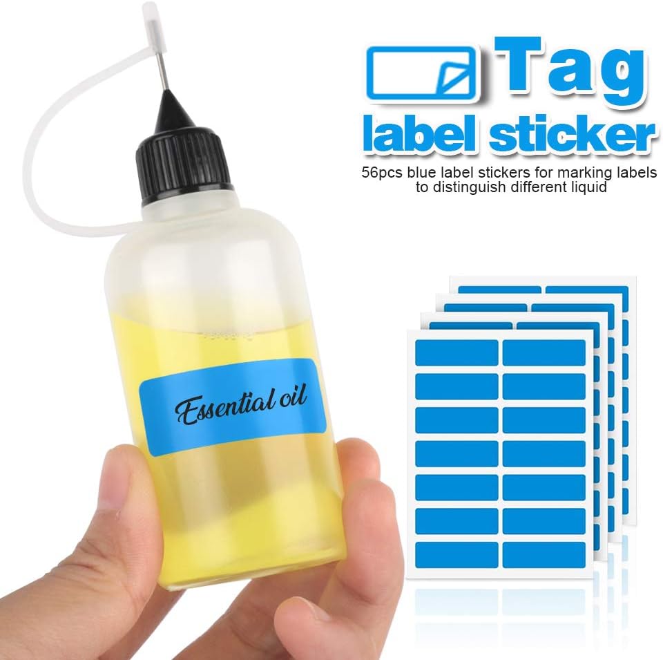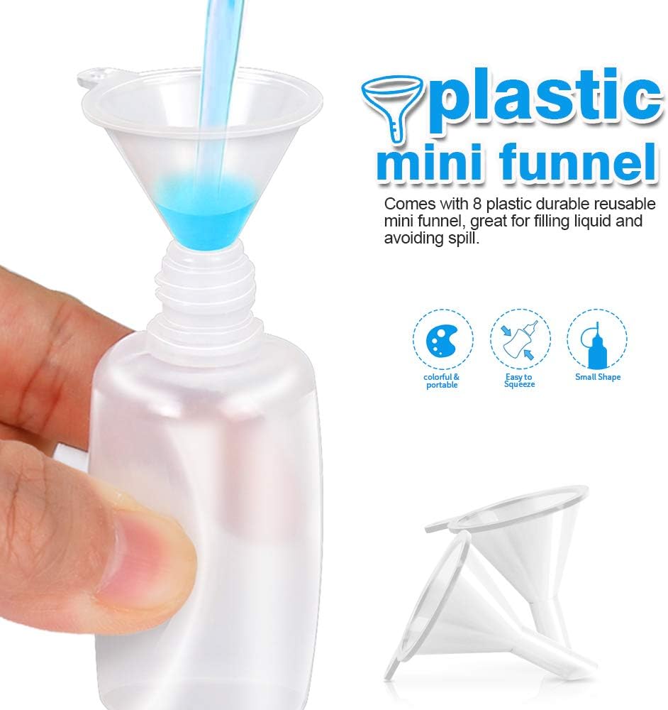 هدية إضافية: بالإضافة إلى 8 أقماع صغيرة تجعل من السهل ملء الغراء أو السوائل. 56 قطعة من الملصقات لوضع علامات على الملصقات لتمييز السوائل المختلفة في زجاجات مختلفة.