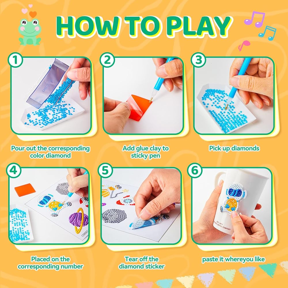 ♥ مجموعات الرسم الماسي للأطفال ♥ - لعب سهل وممتع للأطفال. يعتمد فقط على نفس مفهوم الفسيفساء والطلاء بالأرقام. توجد أرقام مقابلة على كل ملصق فني ماسي تحدد الأماكن التي تلصق فيها الماس، وبعد ذلك يمكنك استخدام الأكريليك الصغير الشبيه بالألماس لإنشاء 15 تصميمًا ونمطًا ملونًا للتصميمات النهائية التي تتألق وتلصق الملصق النهائي على أي شيء ترغب في تزيينه.