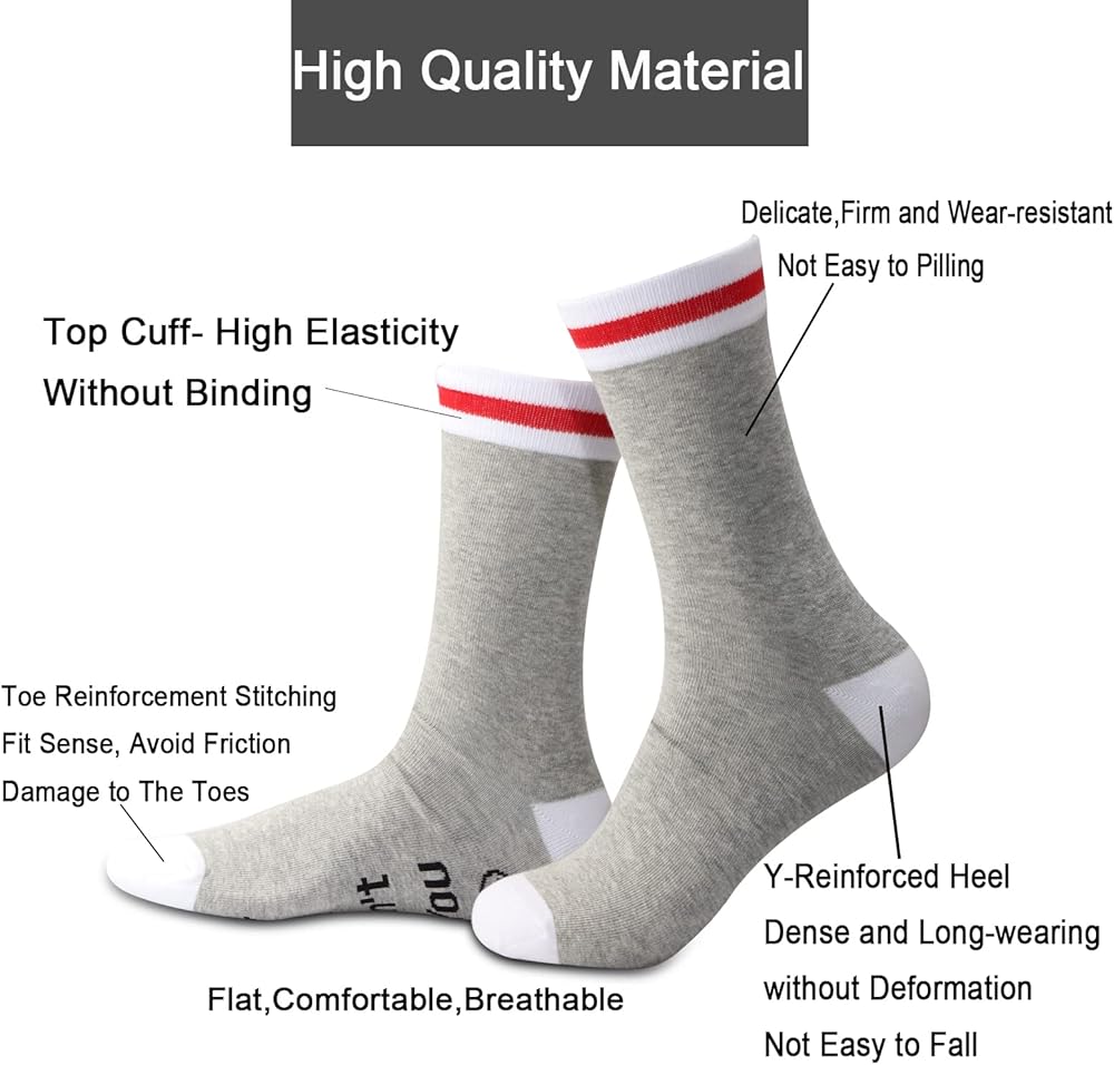 【جودة المادة】نستخدم 80% قطن، 17% بوليستر، 3% إيلاستان لضمان نعومة الجوارب الخاصة بنا، ومريحة، وقابلة للتمدد ومسامية، وملائمة بشكل جيد. تمت خياطة جميع الكلمات والصور مباشرة في الجوارب بدلاً من طباعتها، لذلك لن تتقشر.